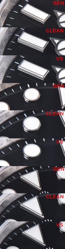 ④ 夜光インデックス: 丸、四角、三角の各インデックスの金属枠をご覧ください。Clean工場のエッジは丸みを帯びて丁寧に研磨されていますが、VS工場は粗さが目立ちます。