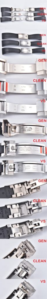 ⑧ クラスプ(バックル)のカーブ: VS工場のバックルは、外側の金属の湾曲(弧度)が足りず、手首に沿うようなフィット感が得られません。Clean工場は本物のカーブを忠実に再現しています。