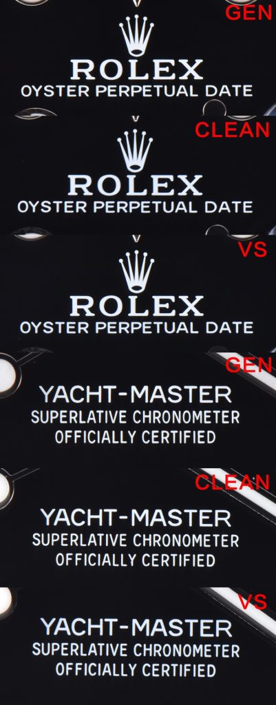 ⑥ インナーリング(内影): 文字盤外周の「ROLEX」ルーレット刻印について、VS工場のレーザー刻印はやや粗く、Clean工場の方がシャープで深みがあります。