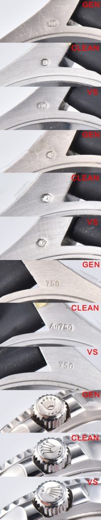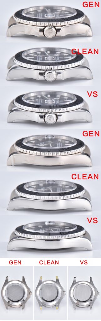 ① ケース形状: VS工場のケース形状は、本物と比較して大きな違いがあります。一方、Clean工場はケース側面のカーブ、ラグの面取り、ベゼルの歯車の研磨に至るまで、本物に近い繊細な処理が施されています。
