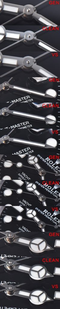 ③ 針の立体感と軸: VS工場の針は平面的で立体感に欠けます。さらに、秒針の中心にある「軸(ピニオン)」の形状が完全に間違っています(中空構造が再現されていない)。Clean工場の針は本物に近い立体感と正しい軸を備えています。