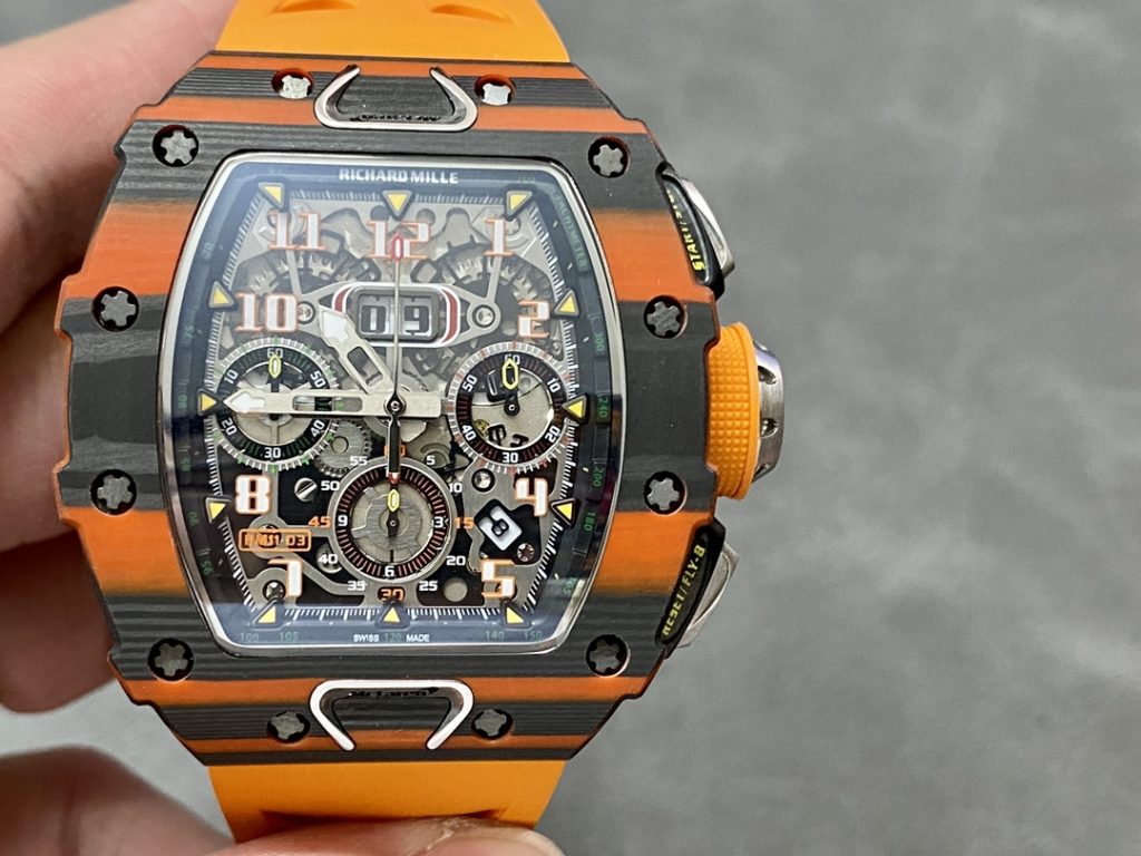 - プロの視点: RM11-03の難しさは、極めて複雑な多層ダイヤルとフライバック機能にあります。RMの老舗であるKVF工場は、ビッグデイトの切り替わりとインダイヤルの安定性において最も信頼できます。一方、Sonic工場はオレンジ・クオーツTPTの発色で勝っており、マクラーレンのスーパーカーが持つスピード感を見事に再現しています。