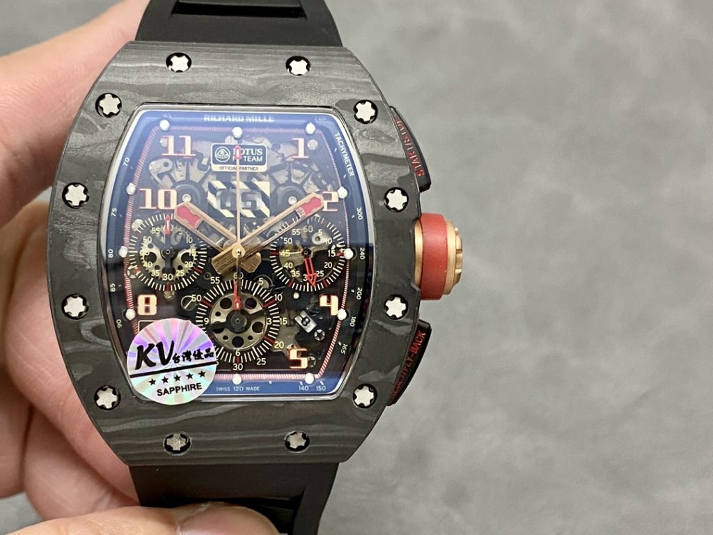 - プロの視点: RM35-02は現在市場で最も熱いモデルです。zf工場が2026年に発表したV4バージョンは、カーボンケース特有の「ダマスカス模様」を完全に攻略し、一本一本異なる美しい層を描き出し、エッジのバリもありません。ムーブメントはインカブロックの位置や歯車の輪列が純正と一致しており、シースルーバックから見えるローターの回転も極めて滑らかです。黒カーボンに赤いストラップの組み合わせは、圧倒的なオーラを放ちます。
