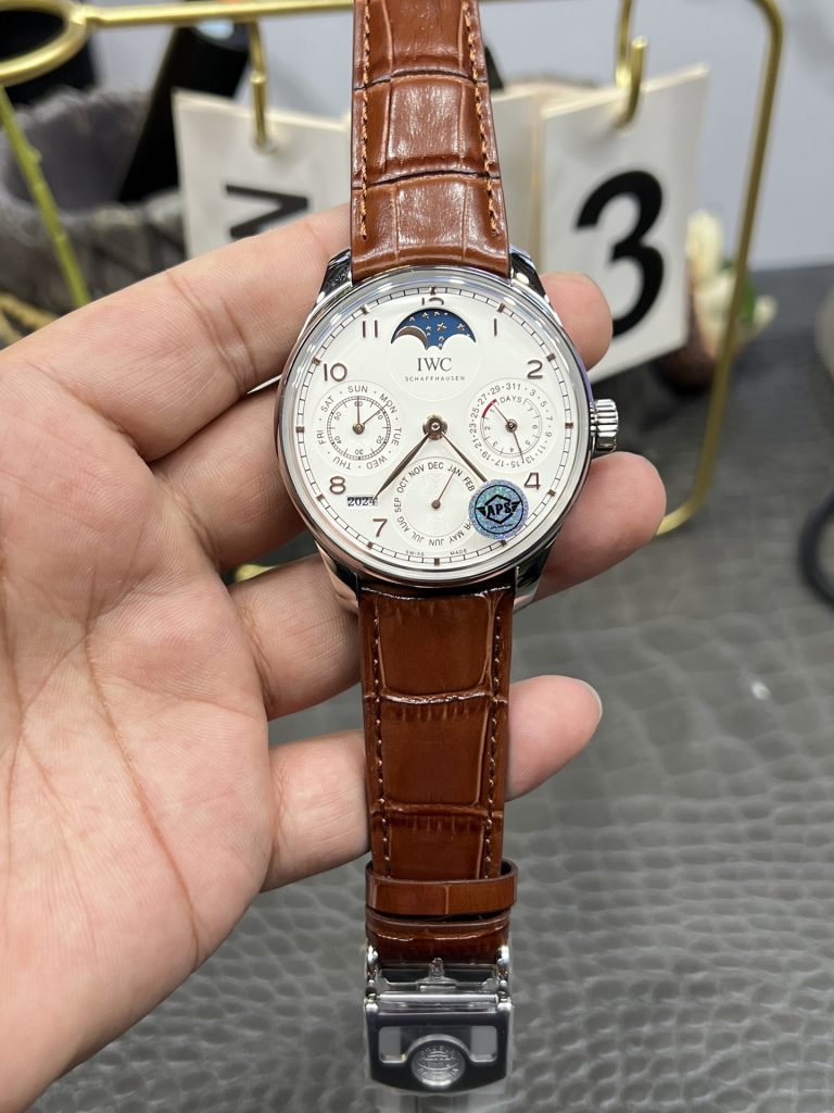 - プロの視点: かつて永久カレンダーはレプリカの「絶対禁止エリア」でした(昔のものはサブダイヤルを曜日や月に見立てただけのダミー機能でした)。しかしAPS工場は近年、複雑機構の開発に注力しており、リューズ操作で全ての日历機能を実際に調整できるバージョンを完成させました。純正のように「一度設定すれば2100年まで調整不要」とはいきませんが、文字盤に敷き詰められた複数の針が全て機能する様は、機械式時計としての抗えない魅力を持っています。