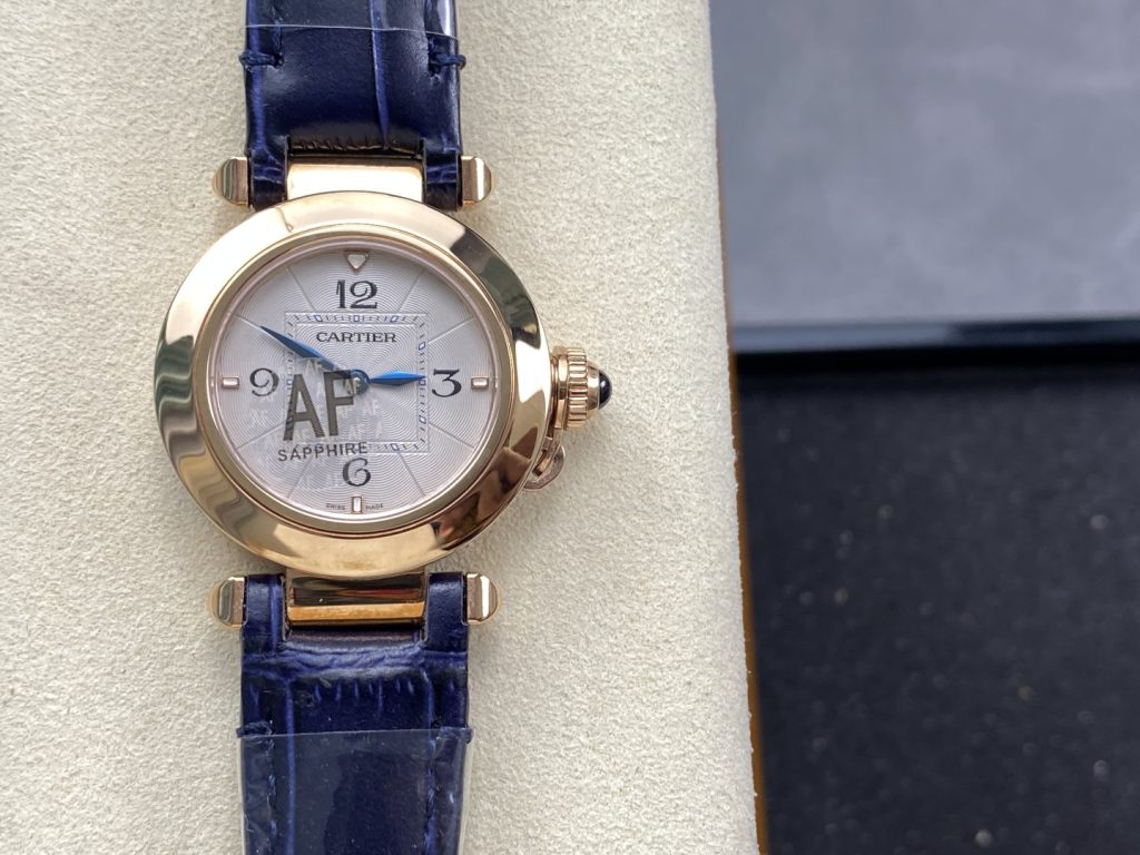 - プロの視点: パシャシリーズは、防水用のリューズキャップとそれを繋ぐ特徴的なチェーンデザインで有名です。AF工場は2026年、この複雑なリューズロック機構を完全攻略しました。チェーンの面取りが滑らかで肌を傷つけないだけでなく、リューズトップに埋め込まれたブルースピネルも透き通るような美しさです。丸い文字盤に四角いレイルウェイトラックという個性的なデザイン。ミヨタ9015改ムーブメントを搭載し、個性を追求する方にとって至高の一本です。
