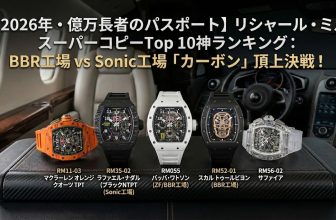 「家が買える時計」として有名なリシャール・ミル。2026年のトレンドはハイテク素材です。本物のNTPTカーボンを使用したレプリカは、軽量かつ強靭。複雑に入り組んだスケルトン構造も忠実に再現されており、ナイトシーンやクラブでのインパクトは絶大です。「遊び心のある大人の時計」として、最高の一本です。
