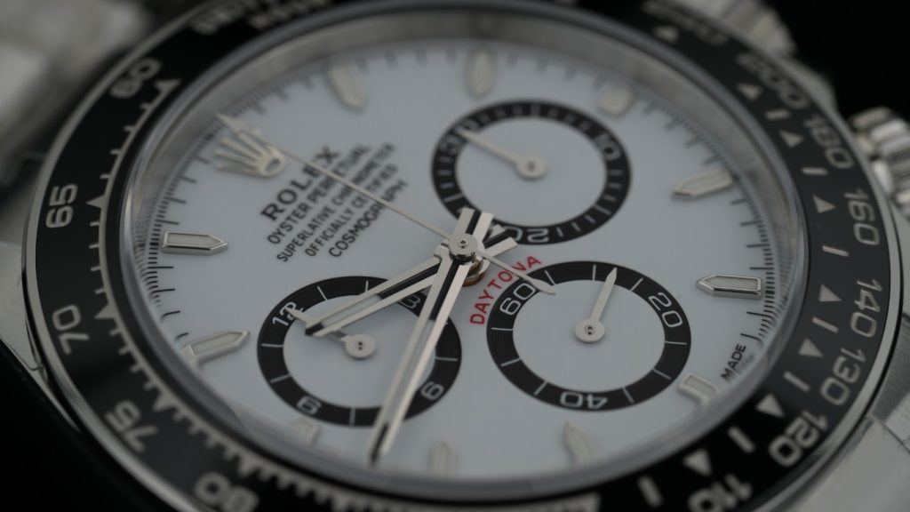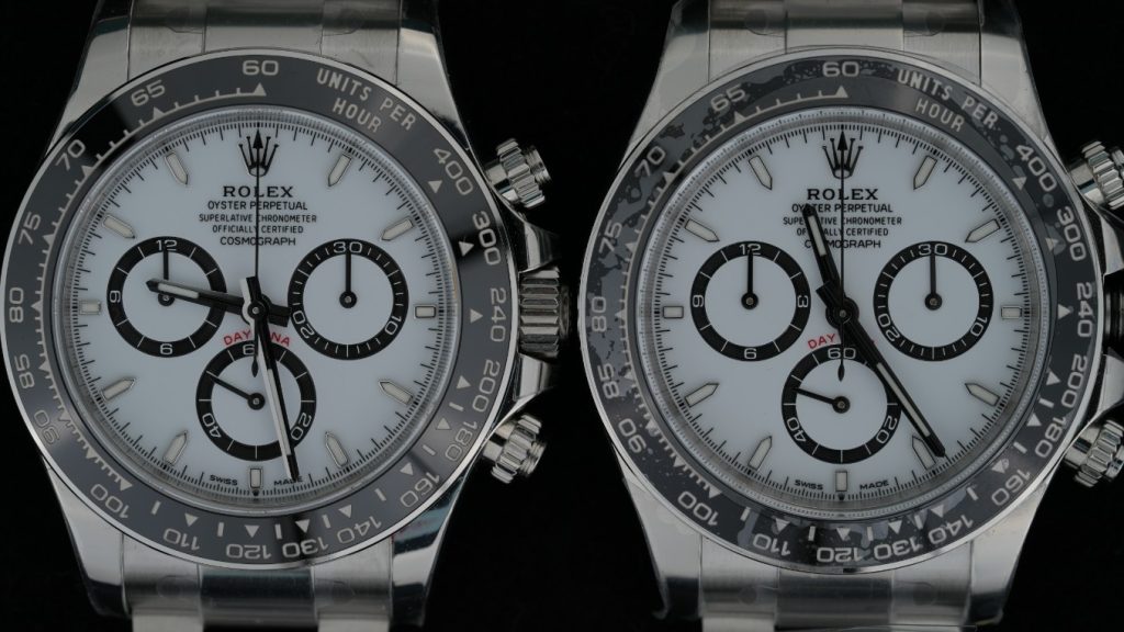 ただし、この色差は極めて微小です。このように2本を隣り合わせて並べ、強力な照明の下でじっくり見比べて初めて気がつくレベルです。本物(Gen)のデイトナにも製造年によって文字盤の色温度に個体差があるため、どちらも「正解」の範囲内と言えます。