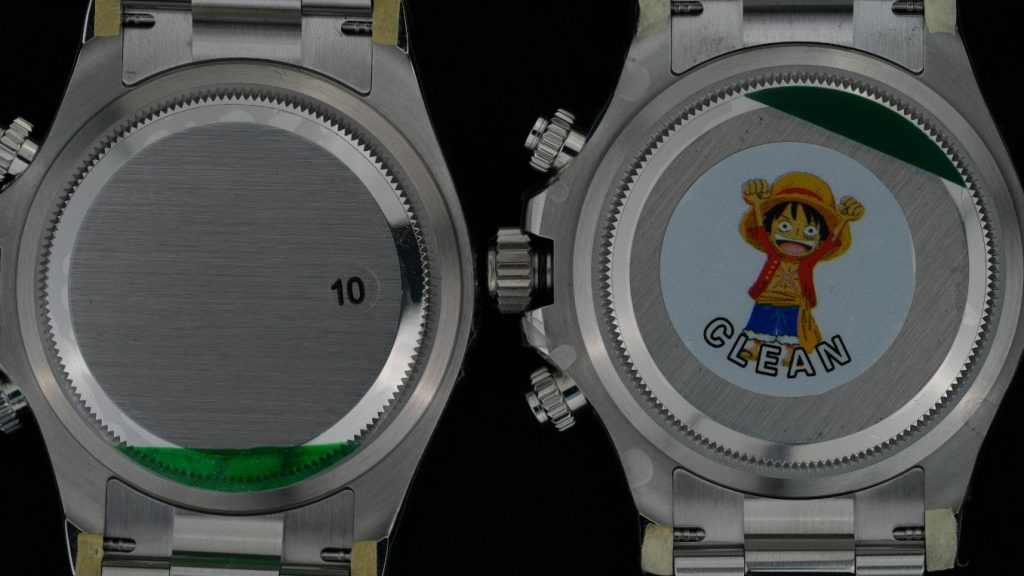 裏蓋を見ても、左がVS工場(10のシール)、右がClean工場(ルフィのシール)というマーキングの違いがあるだけで、ケースの厚みやスクリューバックのギザギザの彫りの深さも全く同じです。