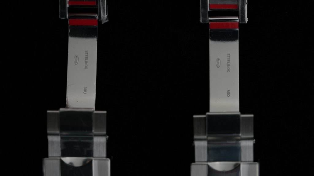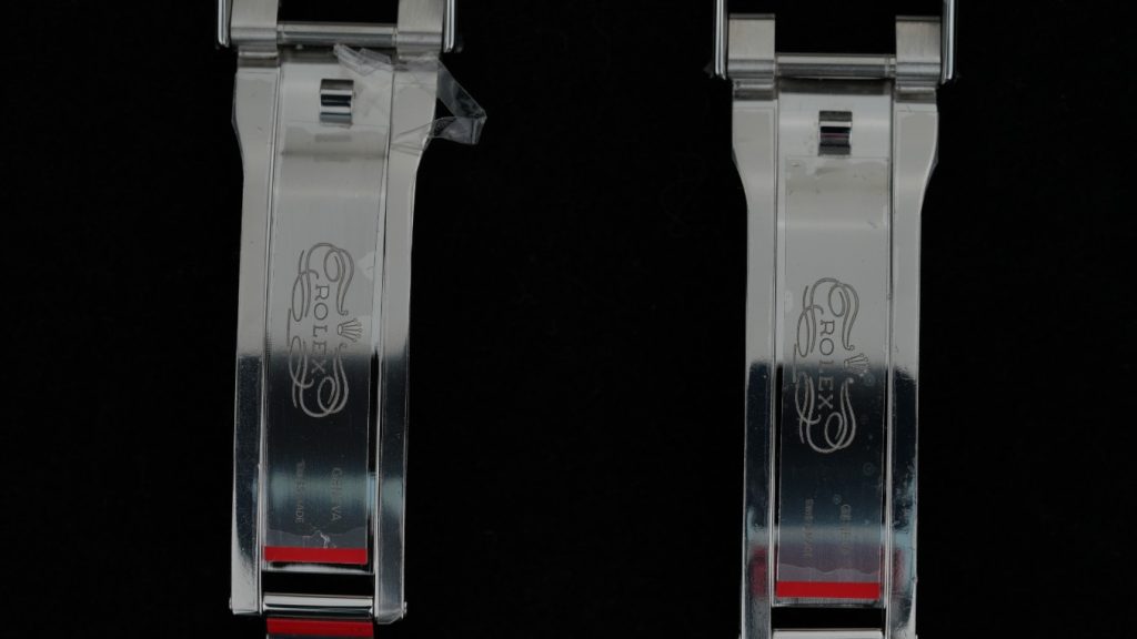 - 内部の刻印: クラスプ内部の「ROLEX」「GENEVA」「STEELINOX」の刻印の深さ、フォントの太さ、レーザーの焼け具合まで、両者に差異は全く見られません。 完全に同じ金型・同じ技術レベルで作られていると推測できます。