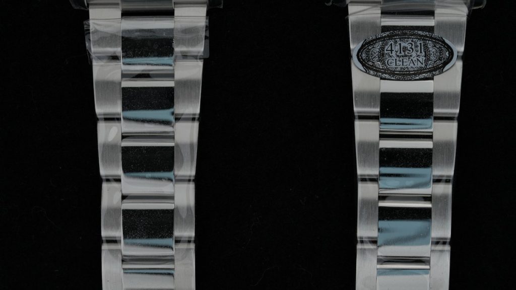 ブレスレットのコマの隙間やヘアライン仕上げも完璧なクオリティです。エッジの処理が滑らかで、安価なコピー品にありがちな「腕に引っかかるような鋭さ」は一切ありません。
