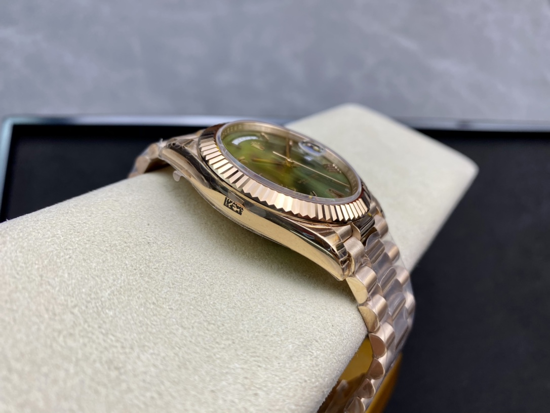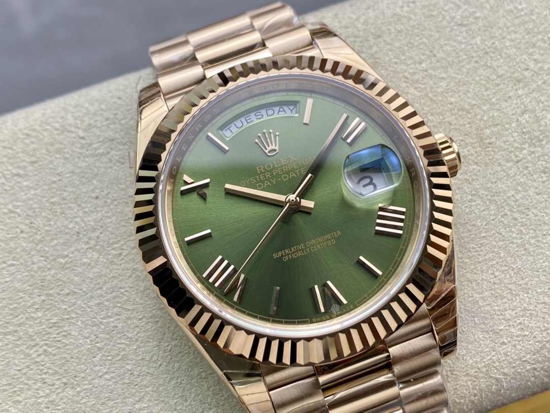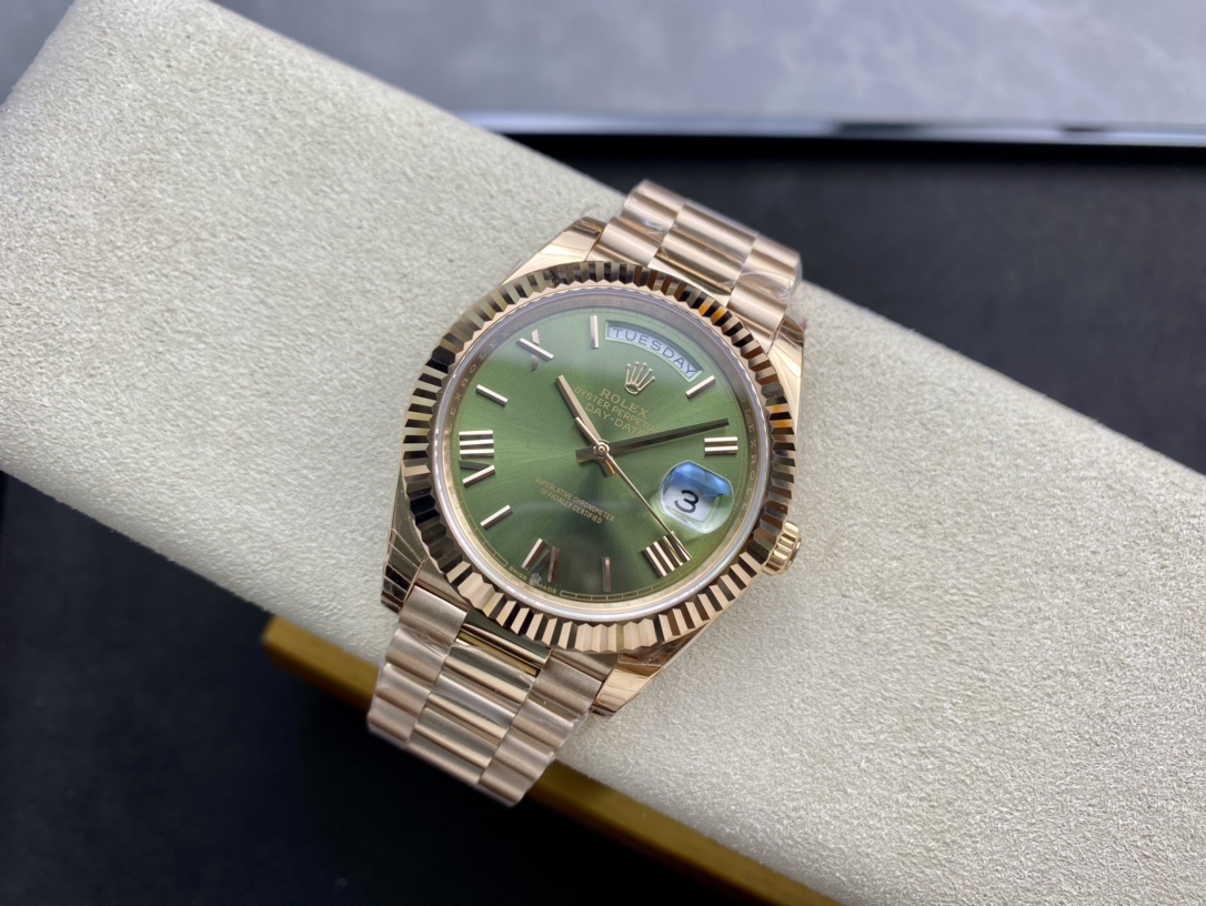 ロレックスの最高峰ステータスを象徴する「デイデイト40」。今回は、コストパフォーマンスと高い再現度で人気を博すEW Factory(EW工場)から、洗練されたゴールド仕様に深みのあるオリーブグリーン文字盤(Ref.228235)を合わせた秀逸なモデルが登場しました。最大の魅力は、実機と完全に一致する「直径40mm・厚さ12mm」のプロポーションを1:1で再現している点です。心臓部には安定性に定評のある3255自動巻きムーブメントを搭載し、実機同様の「曜日・日付のクイックチェンジ」と深夜の瞬転機能を実現。美しい放射状のサンレイダイヤルに立体的なローマ数字が輝く、実用性と高級感を兼ね備えた優れたタイムピースです。
