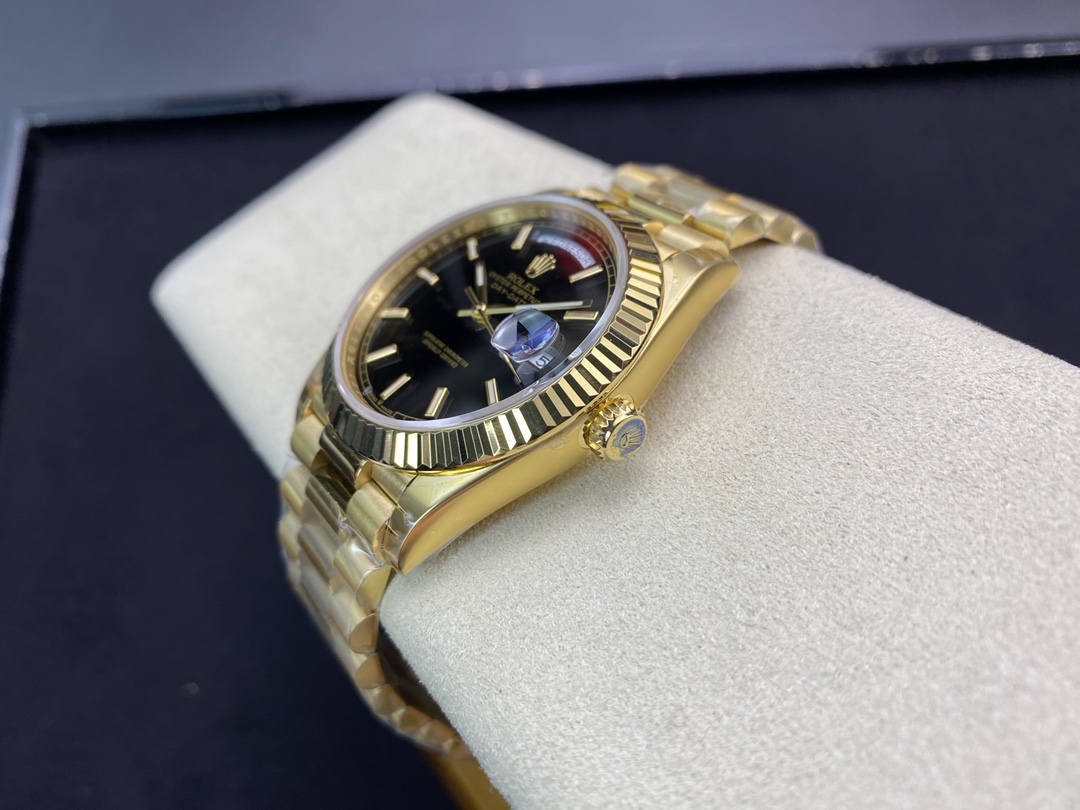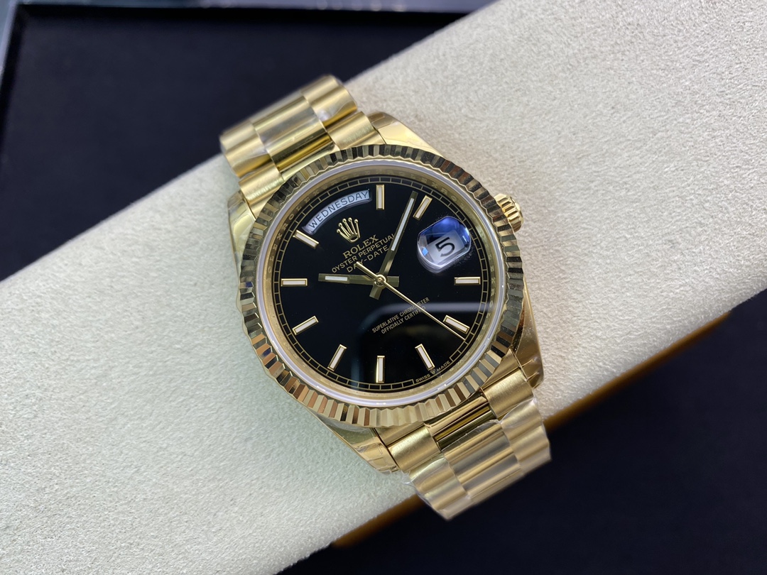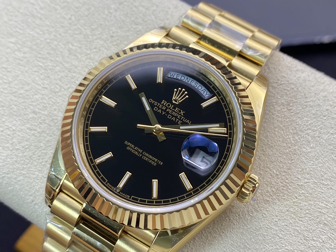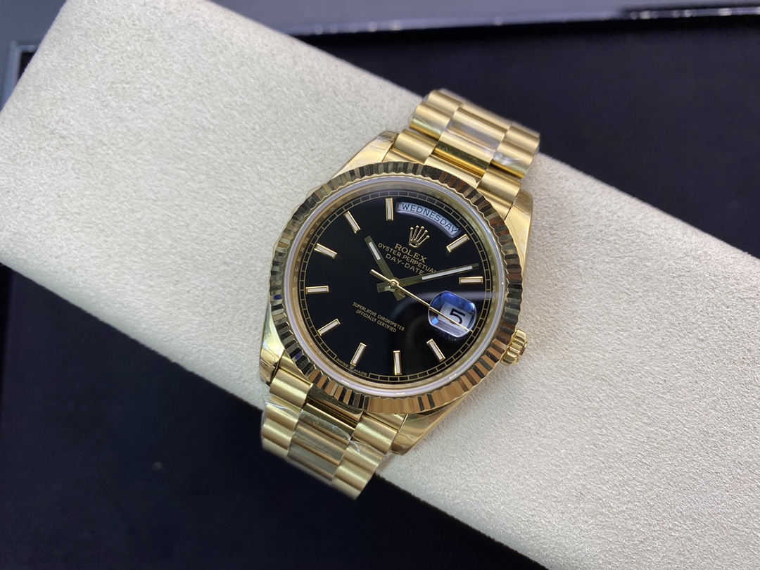 ロレックスの最高峰ステータスを象徴する「デイデイト40」。今回は、コストパフォーマンスと高い再現度で人気を博すEW Factory(EW工場)から、洗練されたゴールド仕様に深みのあるブラック文字盤(Ref.228238)を合わせた秀逸なモデルが登場しました。最大の魅力は、実機と完全に一致する「直径40mm・厚さ12mm」のプロポーションを1:1で再現している点です。心臓部には安定性に定評のある3255自動巻きムーブメントを搭載し、実機同様の「曜日・日付のクイックチェンジ」と深夜の瞬転機能を実現。美しい放射状のサンレイダイヤルに立体的なローマ数字が輝く、実用性と高級感を兼ね備えた優れたタイムピースです。
