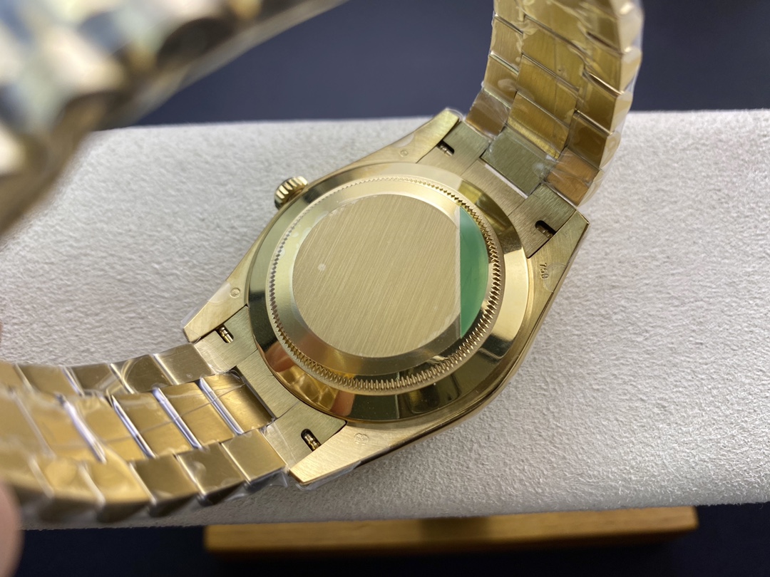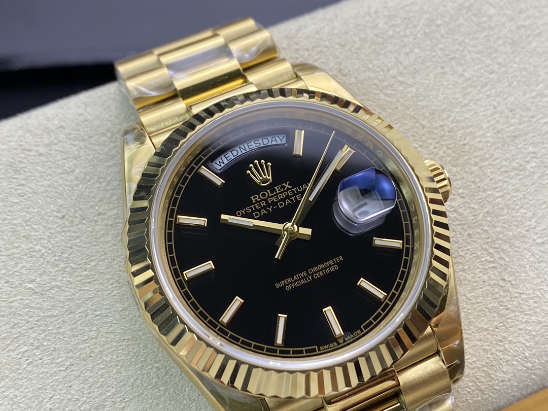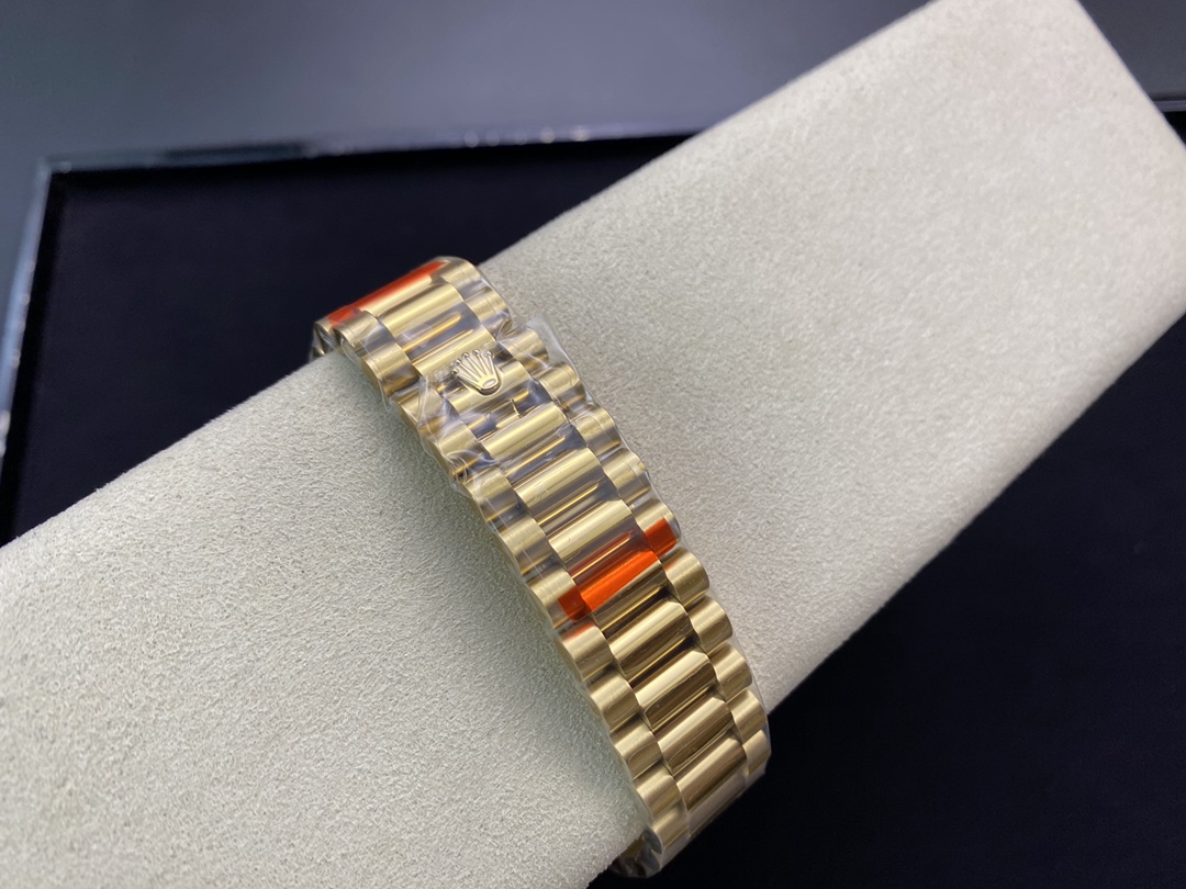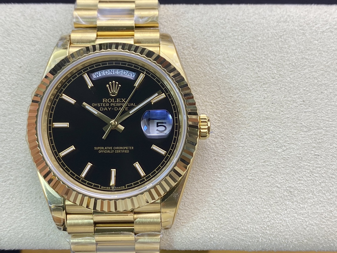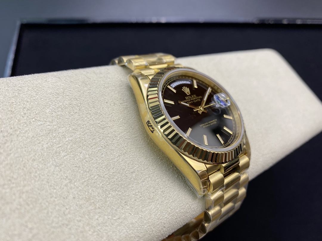 ロレックスの最高峰ステータスを象徴する「デイデイト40」。今回は、コストパフォーマンスと高い再現度で人気を博すEW Factory(EW工場)から、洗練されたゴールド仕様に深みのあるブラック文字盤(Ref.228238)を合わせた秀逸なモデルが登場しました。最大の魅力は、実機と完全に一致する「直径40mm・厚さ12mm」のプロポーションを1:1で再現している点です。心臓部には安定性に定評のある3255自動巻きムーブメントを搭載し、実機同様の「曜日・日付のクイックチェンジ」と深夜の瞬転機能を実現。美しい放射状のサンレイダイヤルに立体的なローマ数字が輝く、実用性と高級感を兼ね備えた優れたタイムピースです。