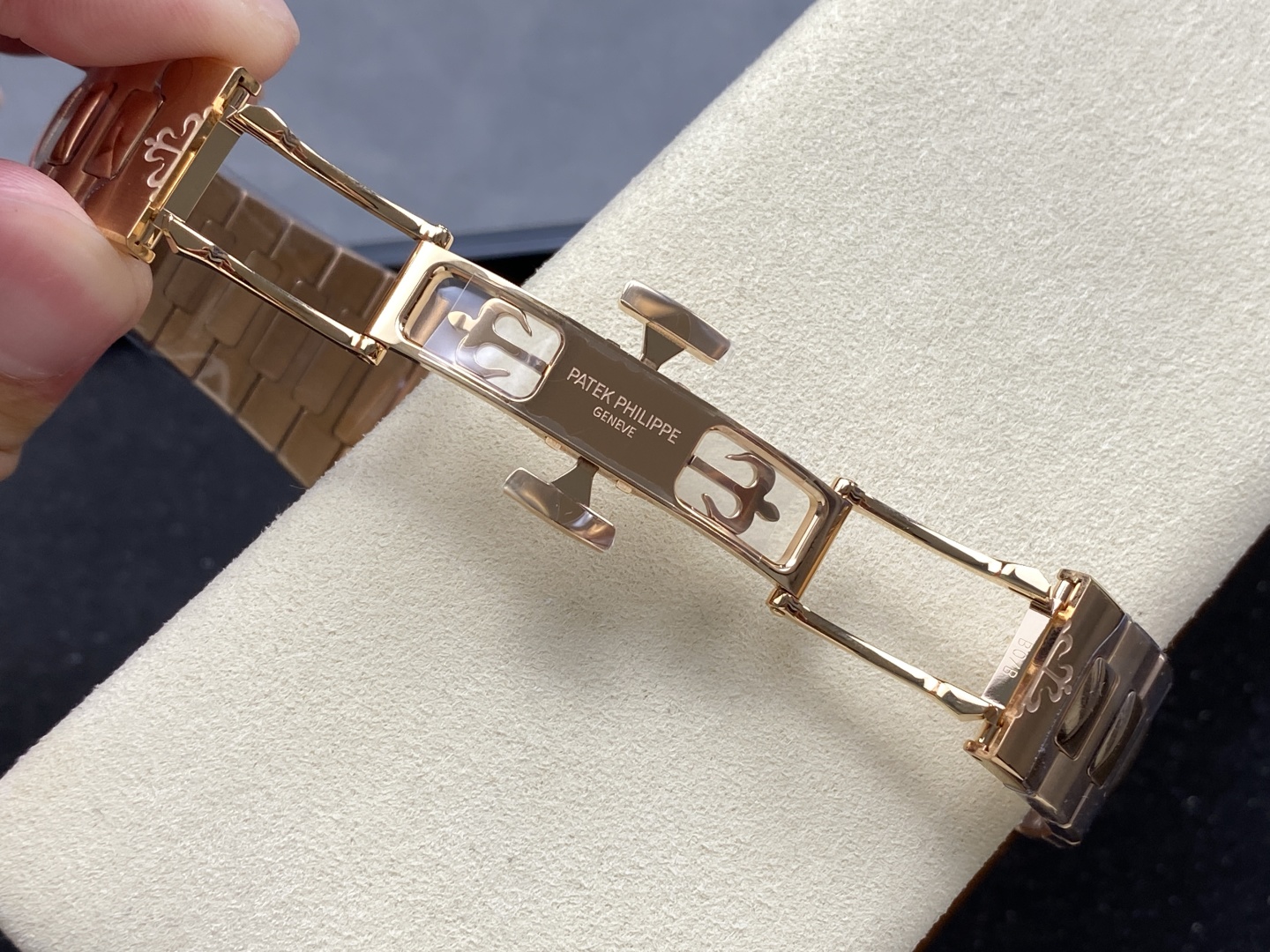 - メーカーが「市場初にして唯一」と豪語する、純正品と100%一致する色調のローズゴールドメッキを採用。赤すぎず黄色すぎない、パテック特有の気品ある暖色系ゴールドを完全に再現しています。