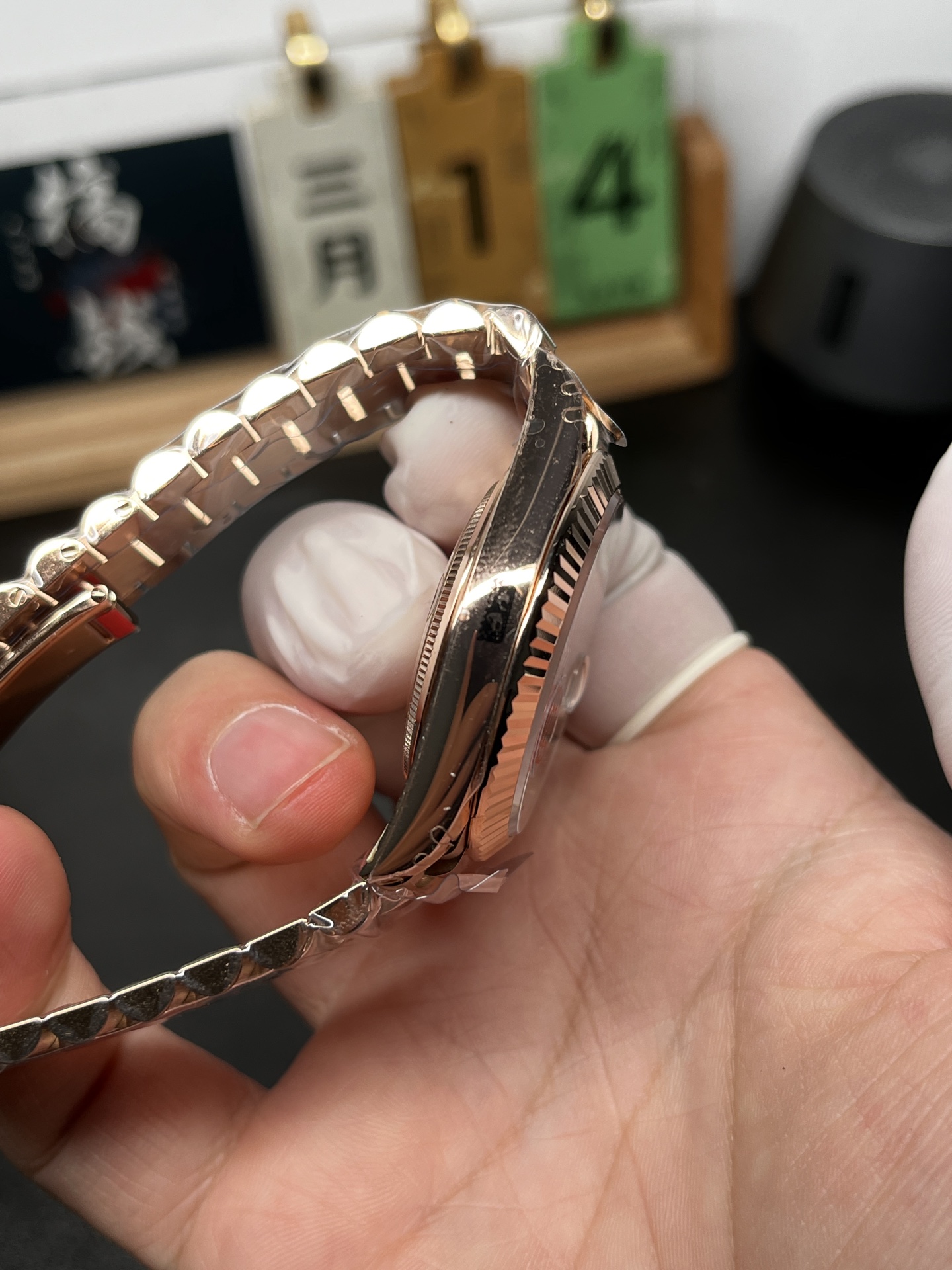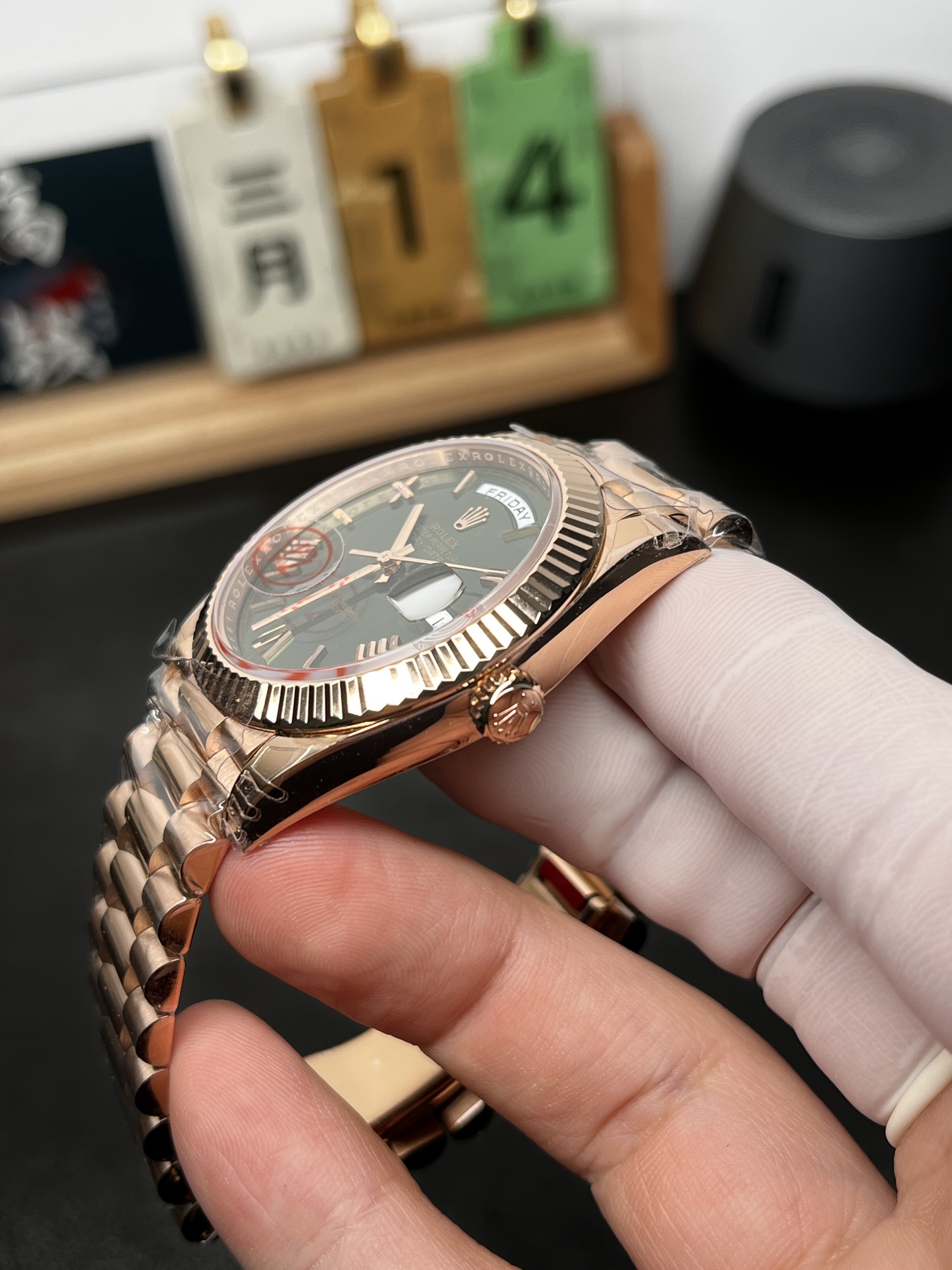 • ダイヤル:オリーブグリーン(サンレイ仕上げ)。純正との類似度90%以上。市場品の粗い粒子感とは一線を画す、シルクのように滑らかで美しい放射状の輝きを放ちます。また、立体的なインデックスや、曜日・日付窓枠の美しいサンドブラスト仕上げなど、細部まで完璧にトレースされています。