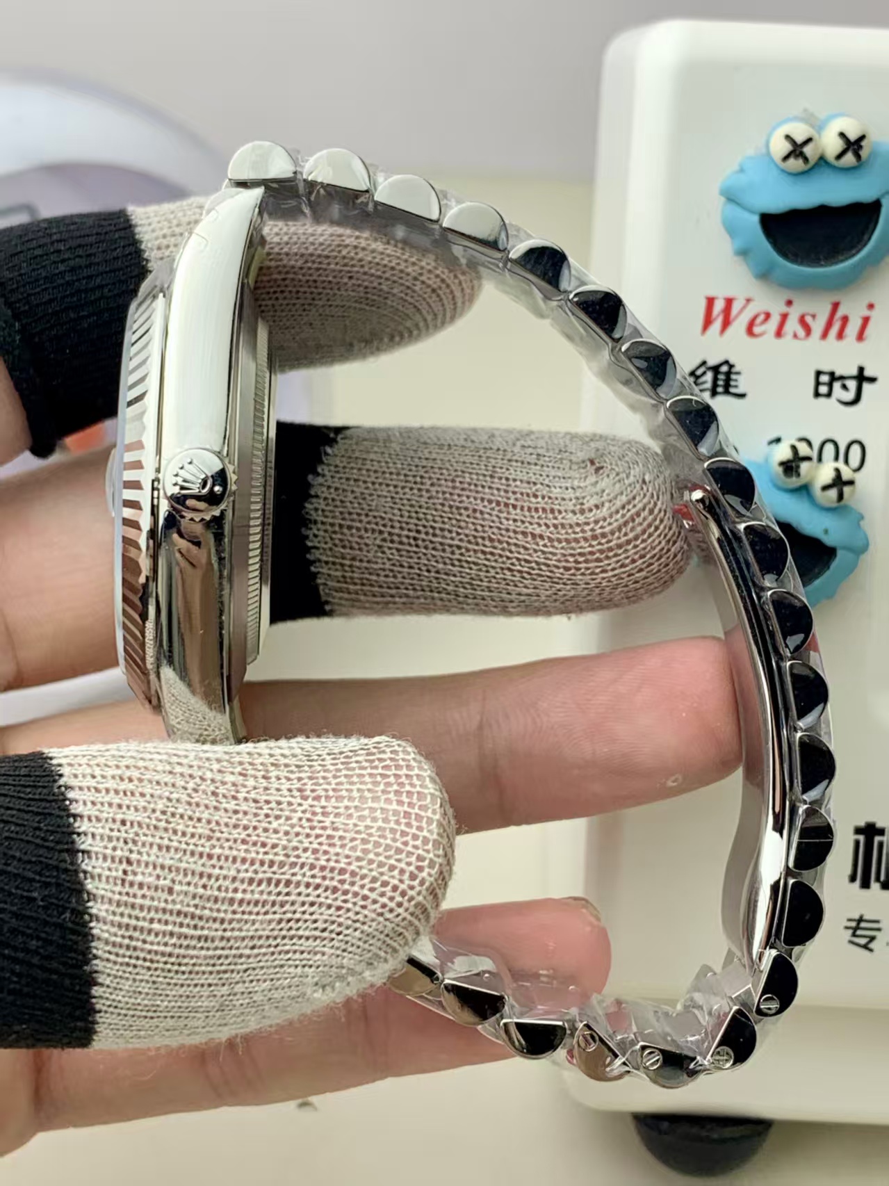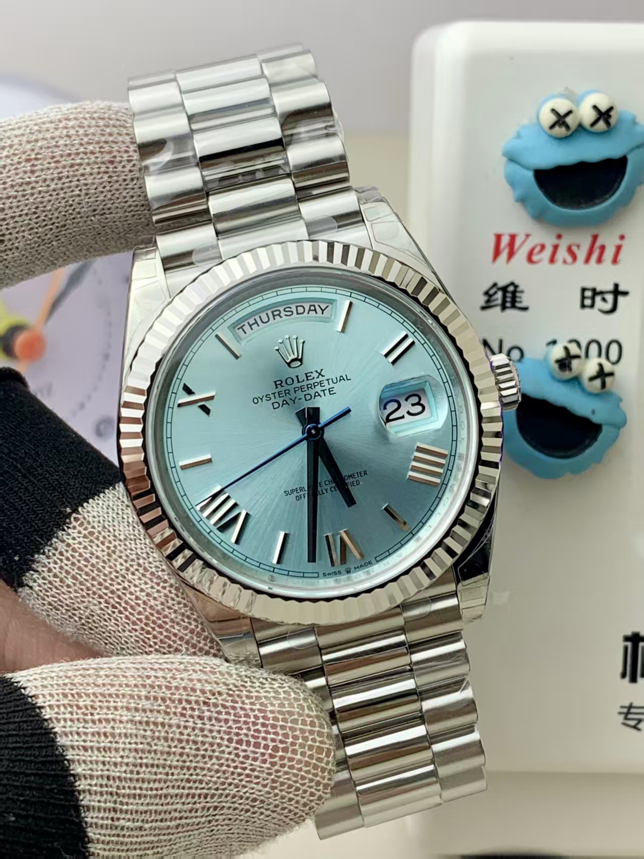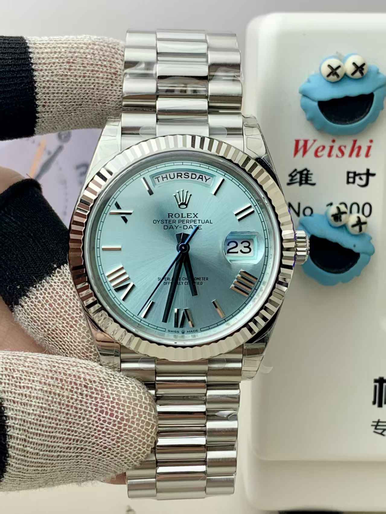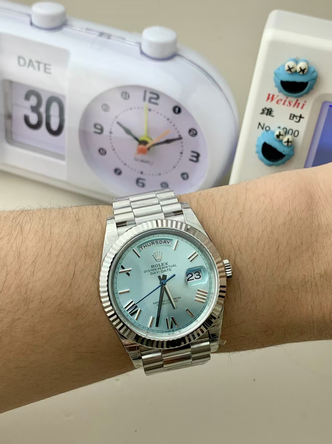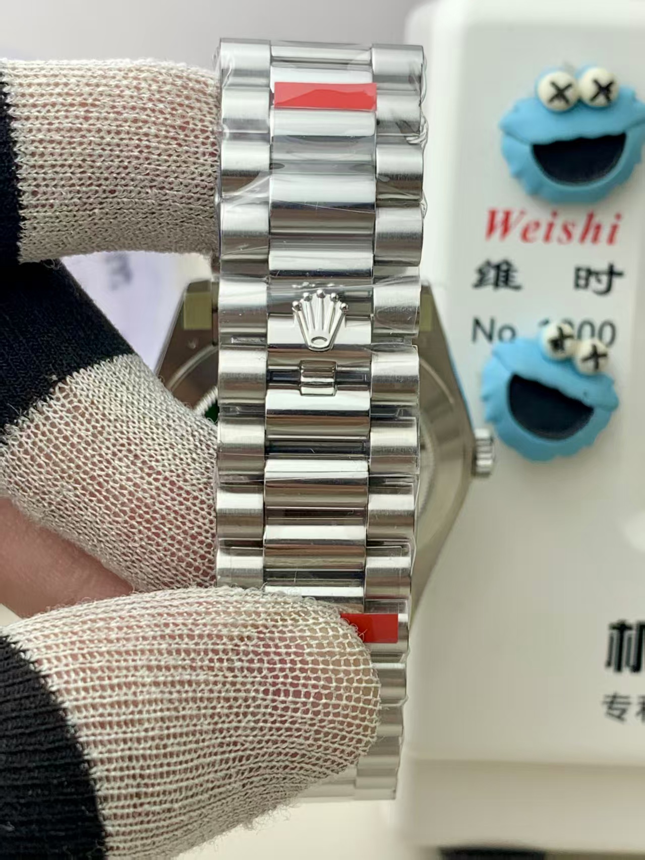 最高峰の技術力を誇るVS Factoryより、ロレックス最高級モデル「デイデイト40 アイスブルー文字盤(Ref.228236)」の究極進化系となる【182g 配重バージョン】がついに完成しました。本モデル最大の偉業は、他社のように「重量を稼ぐために裏蓋を分厚くする(12.7mm等になる)」妥協を一切排除し、純正品と完全に一致する【ケース厚12.1mm】を維持したまま、プラチナ実機に迫るズッシリとした182gの重量感を実現した点にあります。さらに、隙間のない一体成型で作られた純正同等の全25コマブレスレット、圧倒的な安定性を誇る丹東製Cal.3255ムーブメントを搭載。サイズ、重量、内部機構のすべてにおいて「真の1:1」を達成した、現在市場で手に入る最高傑作です。