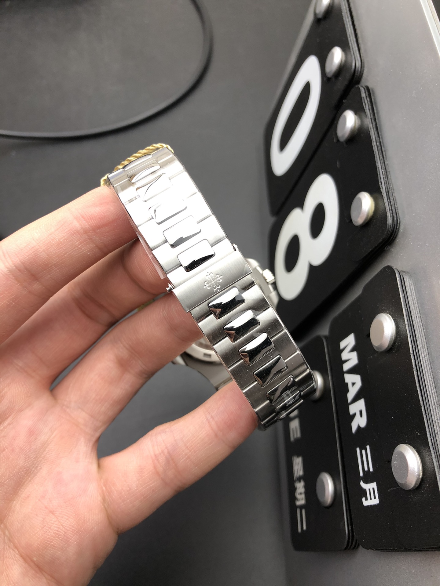 - ブレスレット:新設計の一体型ステンレスブレスレット。リンクの可動角度・ロック音・ヒンジ構造が純正と完全一致。