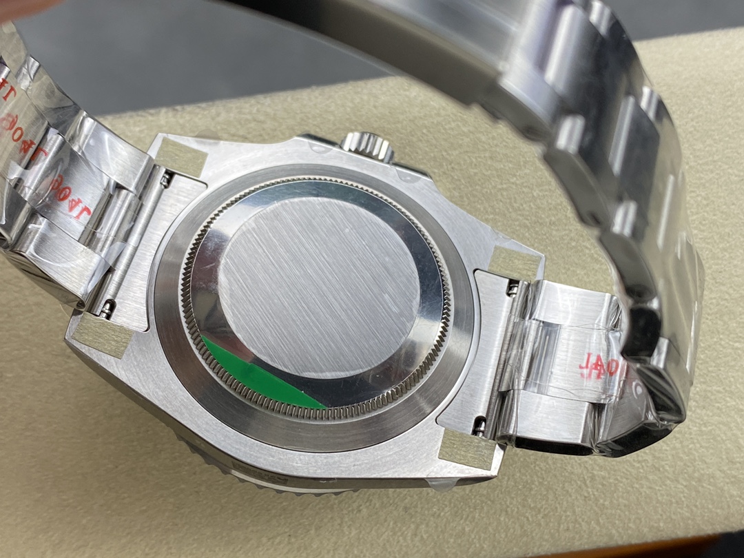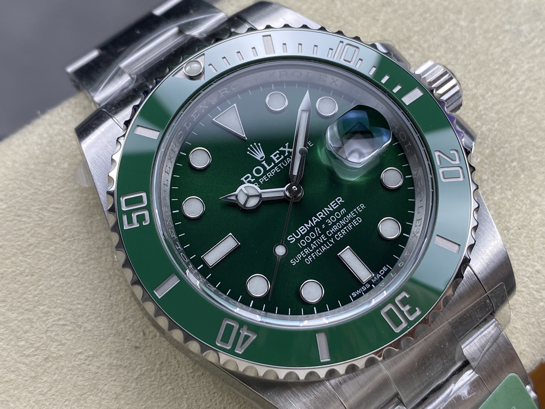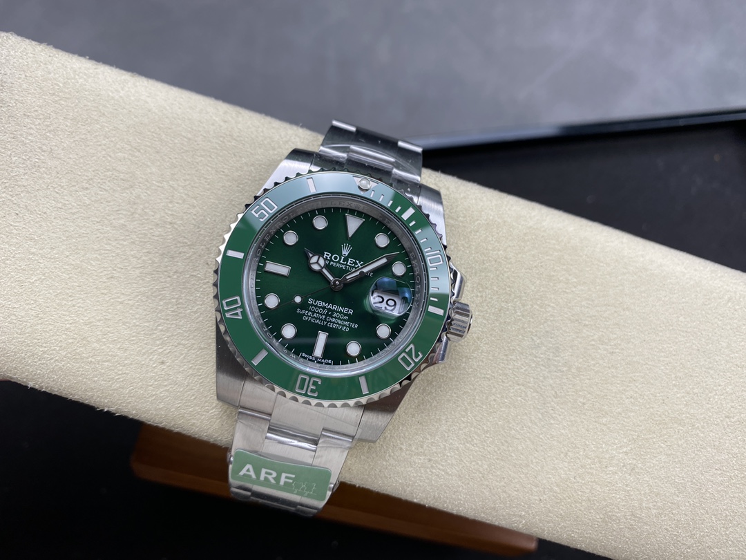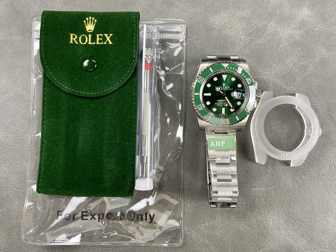 ARファクトリーの最新作となる V4アップグレード版 116610LV は、従来モデルから細部の仕上げ・構造・素材の精度まで大幅にブラッシュアップされた意欲作です。ブルー・パラクロムヘアスプリングを搭載した自社改良Cal.3135、正規品同様の深みあるグリーンCerachromベゼル、より自然なエッジ処理が施されたブレスレットとバックルなど、“手に取った瞬間に分かる完成度” を徹底追求しています。外装の密度感、ベゼルの操作感、刻印の彫りの質感―AR工場らしい重厚な作り込みが光る、完成度の高い“グリーンサブ V4”となっています。