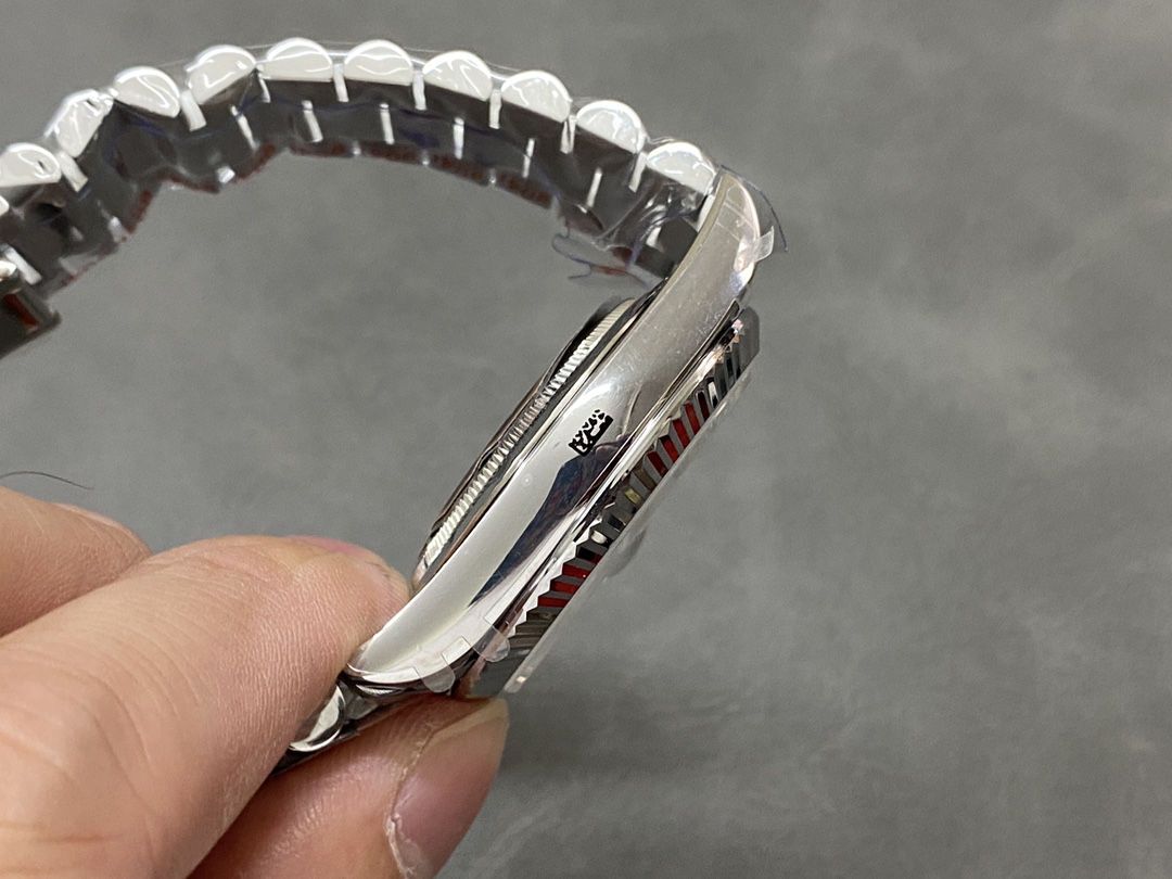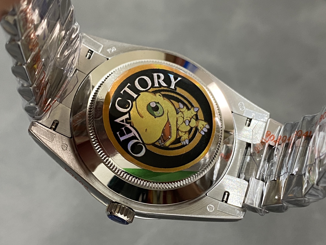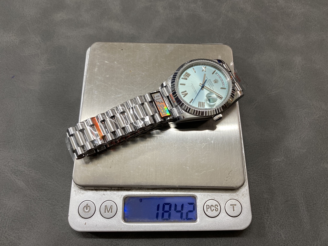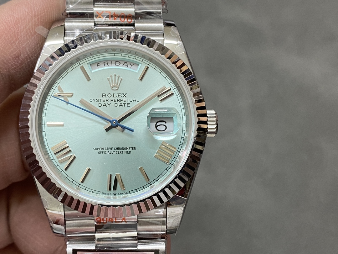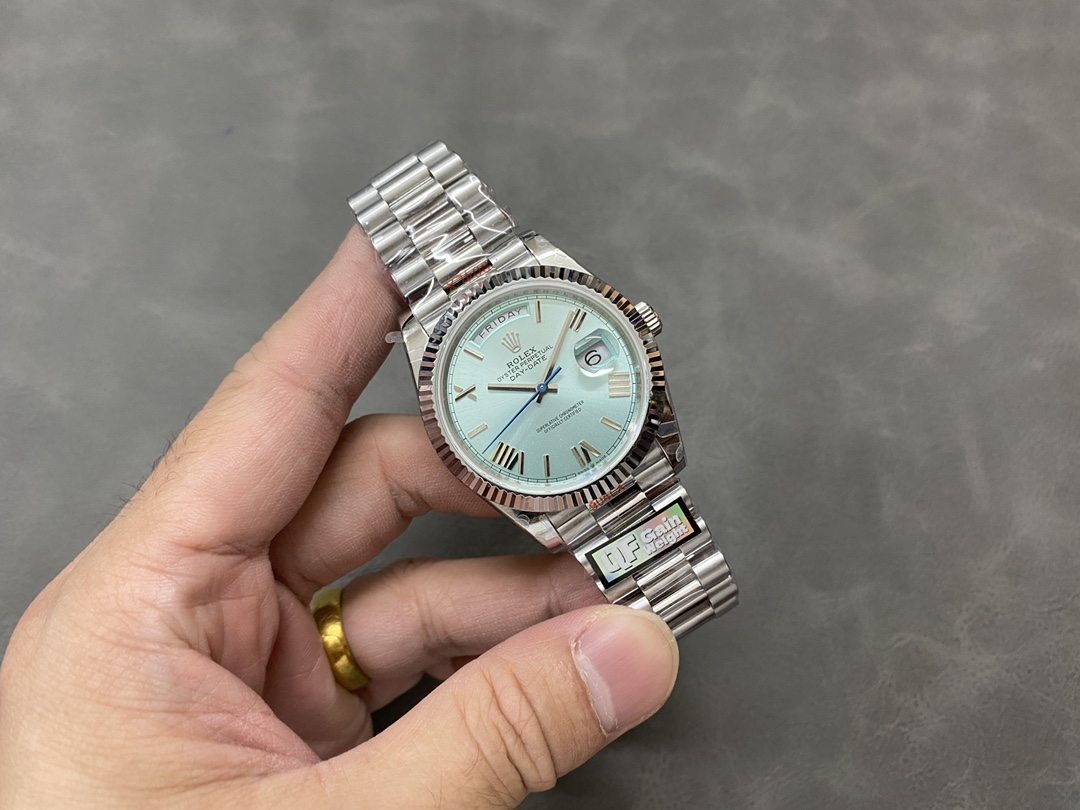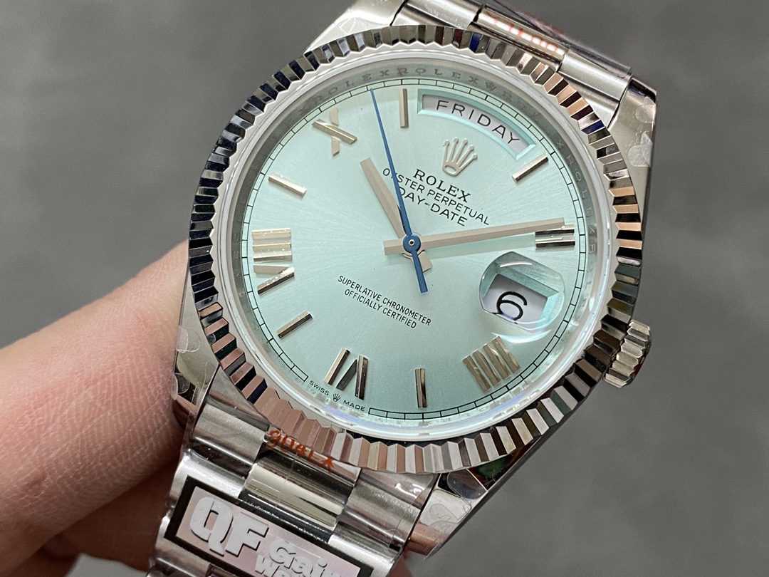 QFファクトリーが手掛ける最新のデイデイト40mm配重版は、クラシックなローマ数字インデックスとアイスブルーのダイヤルを組み合わせた上品なモデルです。落ち着いた色味と繊細な光の反射が特徴で、腕元に控えめな高級感を演出します。ムーブメントにはCal.2836を搭載し、曜日と日付の瞬時切替およびクイックセット機能を備え、日常使いでも高い実用性を発揮します。外装の質感、重量バランス、そして仕上げの精度が絶妙に調和した完成度の高い一本です。