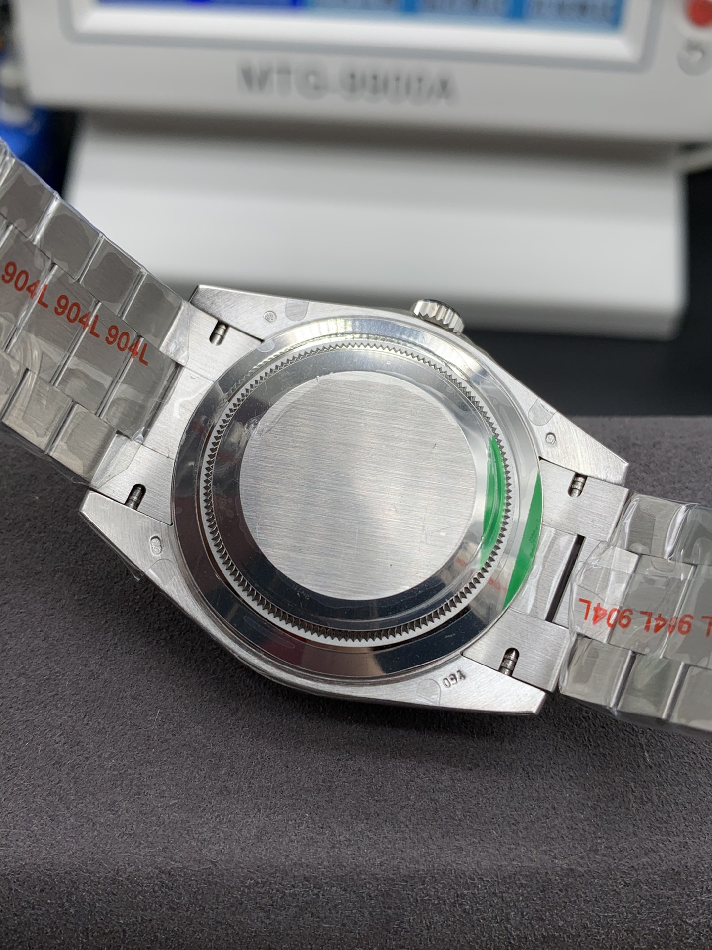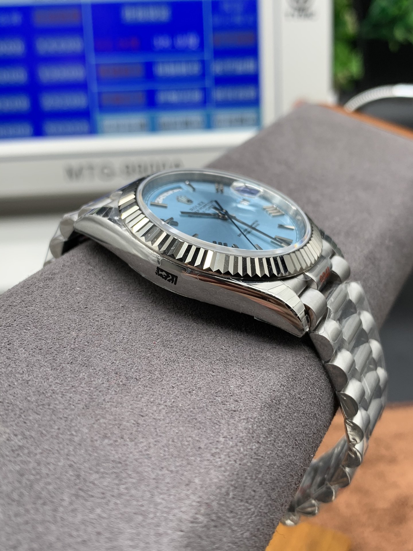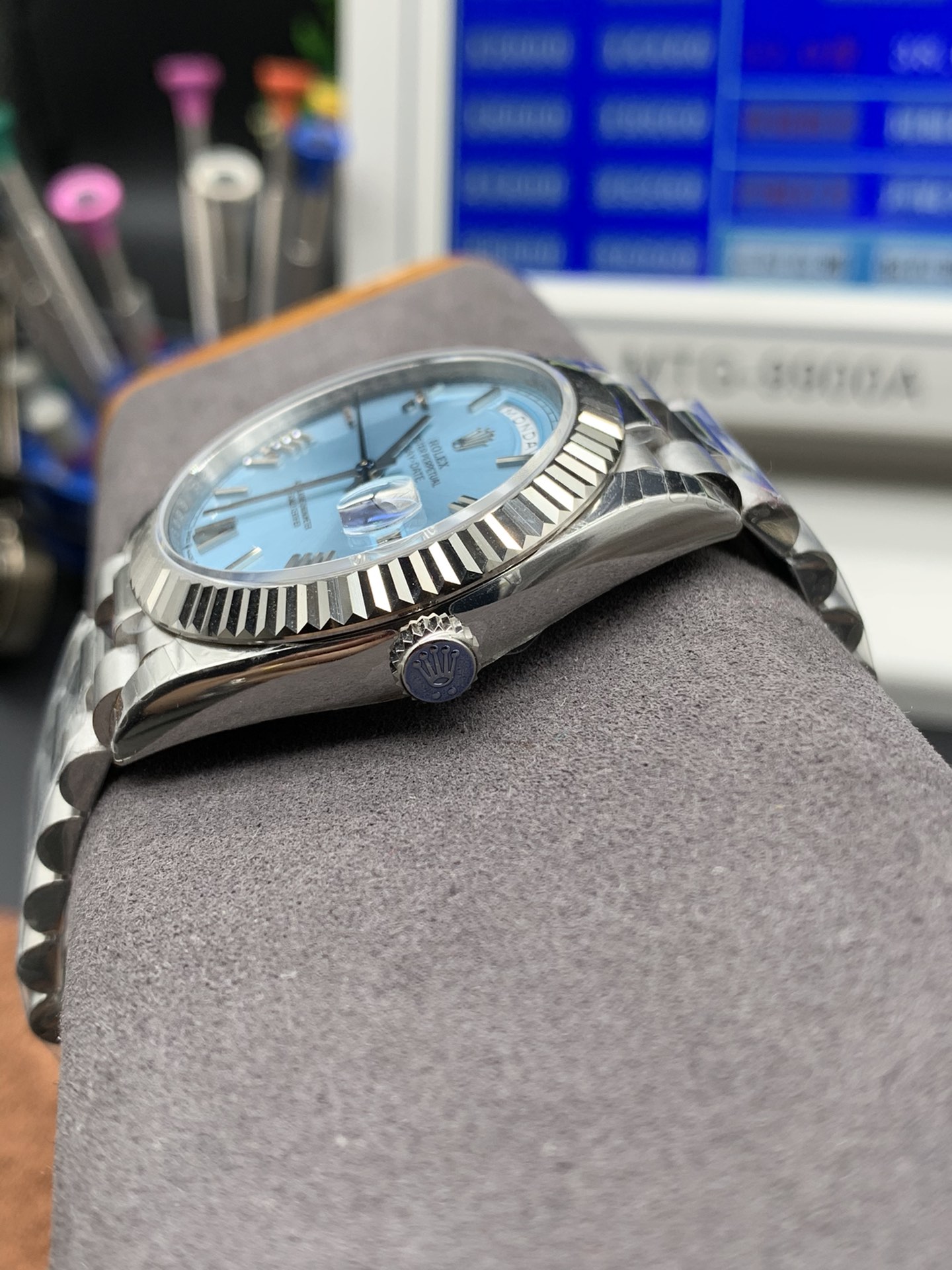 EWファクトリーが手掛けるデイデイト40は、精緻なフルーテッドベゼルと澄み切ったアイスブルーダイヤルを備えた上品なモデルです。ケースプロポーションからディテール処理まで原版を丁寧にトレースし、3255仕様の構造を忠実に再現したコストパフォーマンスの高い一本です。