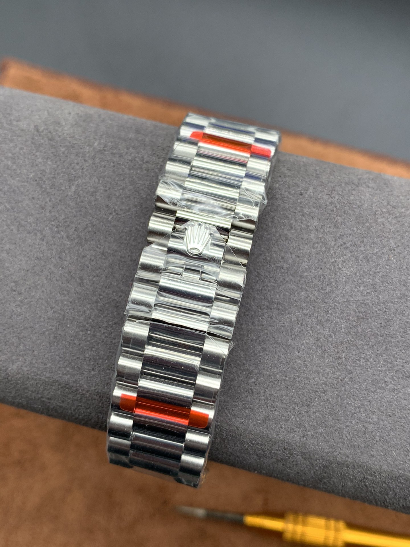 • ブレスレット:プレジデントブレス(904L) 5ピース構造の頭粒を原版と同じ組み立て方式で再現し、ケースとの“段差のない接続”を実現。