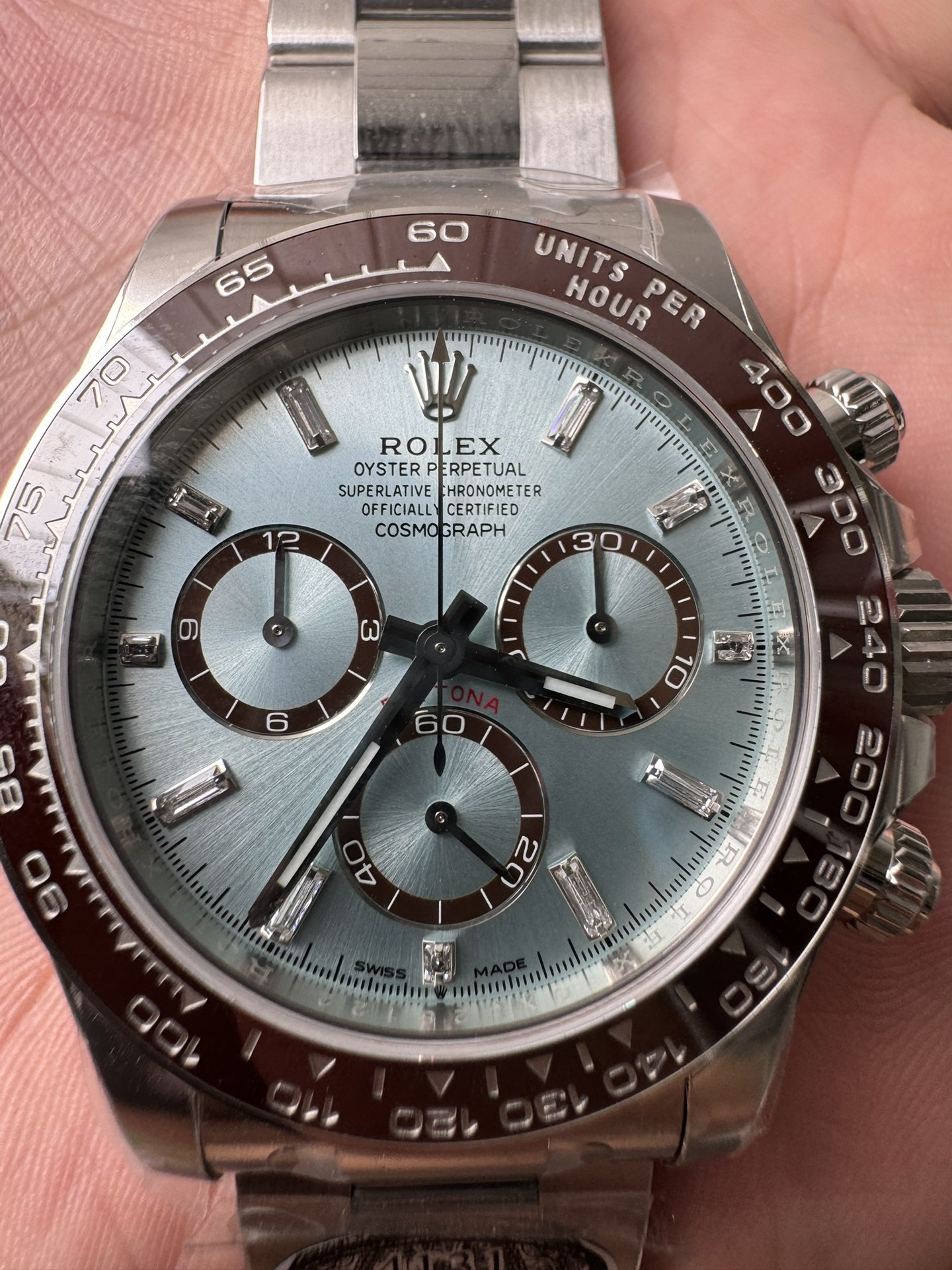 Clean工場が時間をかけて作り上げた アイスブルー デイトナ(プラチナ仕様 126506) が、ついにスケルトン仕様 Cal.4131 を搭載して登場しました。本作は、正規品の“特別色”であるアイスブルー文字盤を忠実に再現するため、原装を分解し、専用で調色・型取りを行った独立開発カラー を採用。さらにプレミアム仕様である バゲットダイヤインデックス(モアサナイト級) を使用し、上品で洗練された輝きを放ちます。ケース・クラスプのマット仕上げやサブダイヤルの処理も正規仕様に合わせ、CLEANの緻密な調色・加工技術が際立つ一本です。