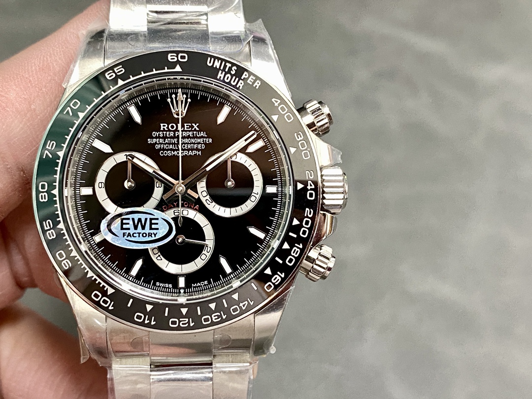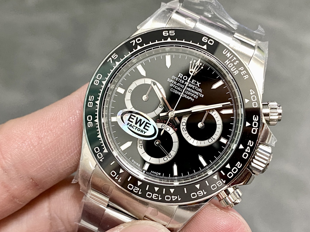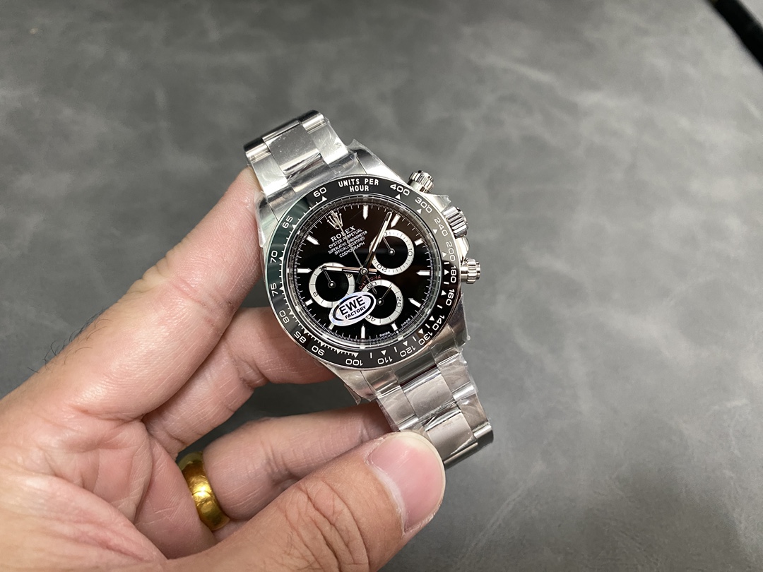 新世代デイトナの特徴である40mmケース、繊細になったインデックス、そして4131ムーブメントのレイアウトを正確に再現した、EWE工場の最新作。最も安定性が高いと言われる“4131一体型ムーブメント”を搭載し、厚み11.9mmの対版ケースや金属エッジ付きセラミックベゼルなど、要点が丁寧に仕上げられた「とにかく壊れにくく実用的なデイトナ」。派手さではなく“使いやすさと完成度”を重視した、まさにコストパフォーマンス特化の一本です。