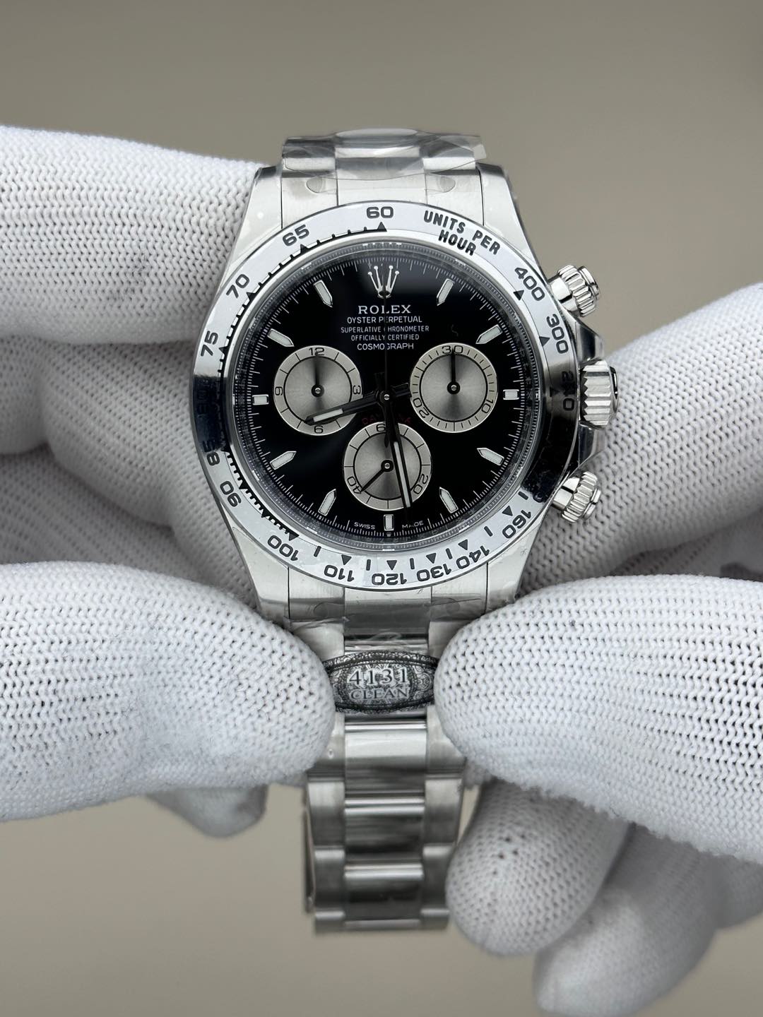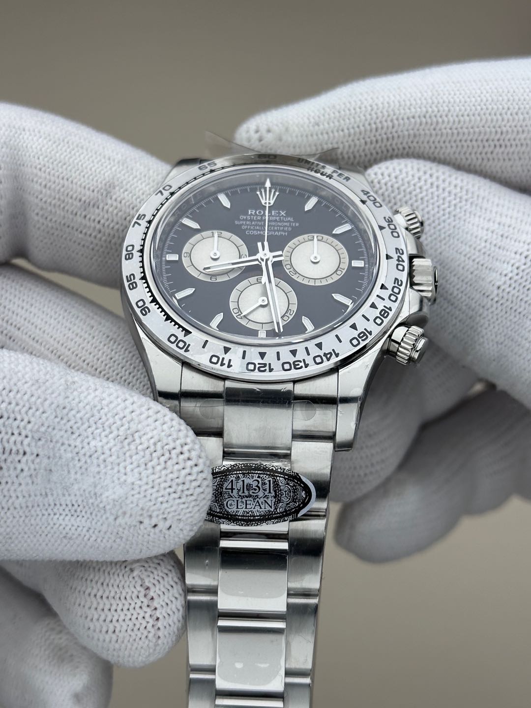デイトナレプリカの最高峰「Clean Factory(Clean工場)」から、待望の新型126509が登場。最大の特徴は、丹東製スーパークローン4131ムーブメントの搭載です。旧作4130から受け継いだ圧倒的な安定性に加え、パワーリザーブは正品同様の72時間を実現。さらに、C工場の真骨頂である「文字盤のプリント精度」と「インダイヤルのサンバースト仕上げ」は、ルーペで見ても隙が見当たらない芸術的な完成度を誇ります。904Lスチールの研磨もホワイトゴールドのような輝きを放つ、現時点で間違いなく最高傑作の一本です。