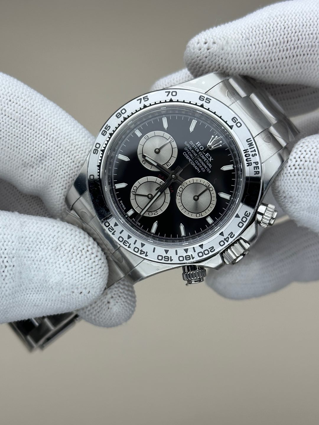 - ダイヤル:ブライトブラック + スチールグレー・インダイヤル。インダイヤルの「同心円サンバースト仕上げ」の粒子感が極めて細かく、光の反射が非常に美しいのが特徴。文字盤のプリント(ROLEXロゴなど)も立体的で滲みが一切ありません。