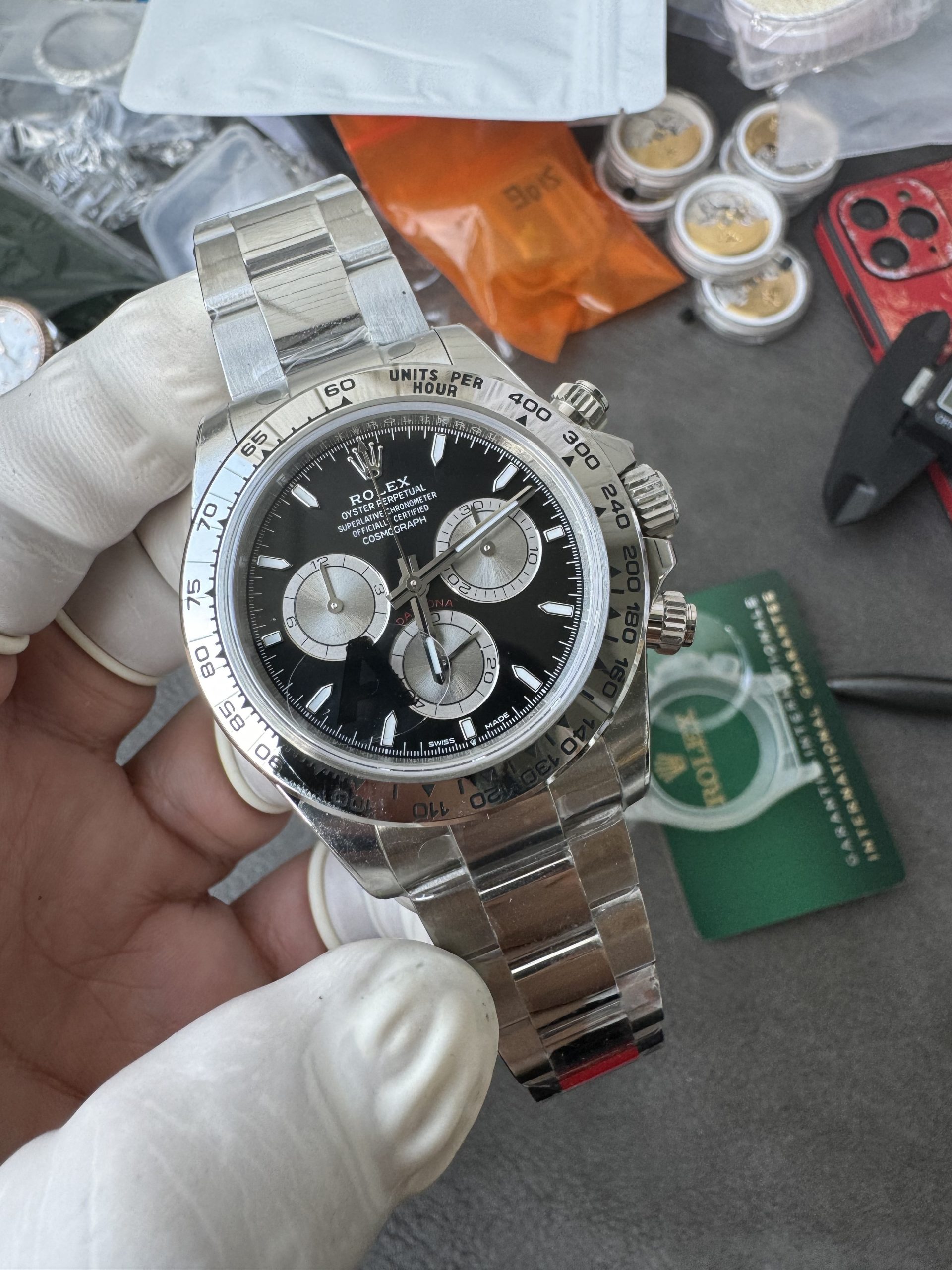業界の常識を覆す、VS Factory製ロレックス・デイトナ 126509の配重版がついに登場。このモデルの最大の革命は、正品に迫る「約183g」という重厚感を実現しながら、ケースの厚みを一切増やしていない点にあります。市場に出回る一般的なタングステン銅合金(酸化してメッキが剥がれやすい)とは異なり、VSは独自の「特注ヘビーメタルケース」を開発。汗による腐食やメッキ剥がれを劇的に改善しました。心臓部には信頼性抜群の「丹東製4131ムーブメント」を搭載しています。重さ、薄さ、耐久性、精度のすべてを極めた決定版です。
