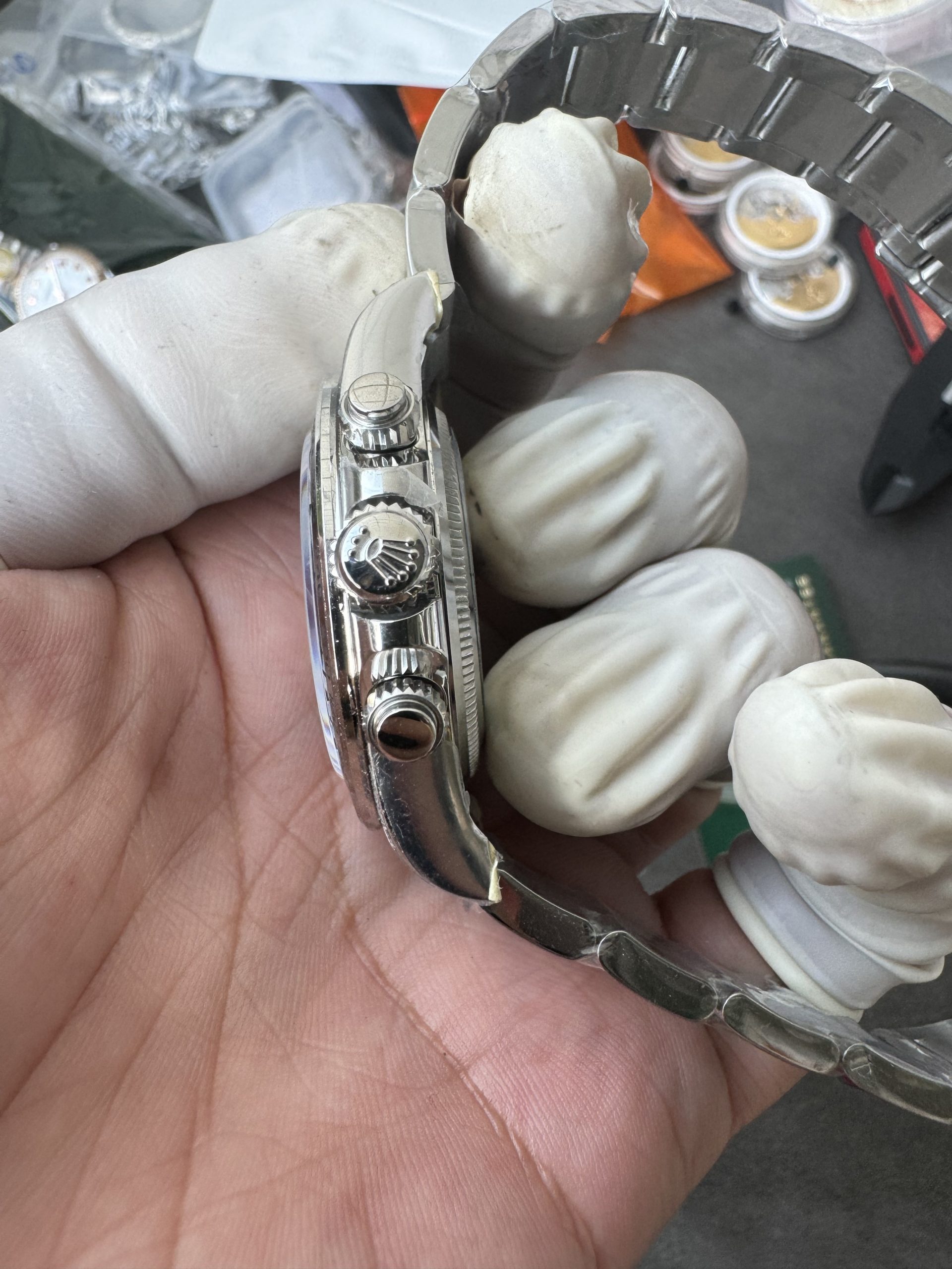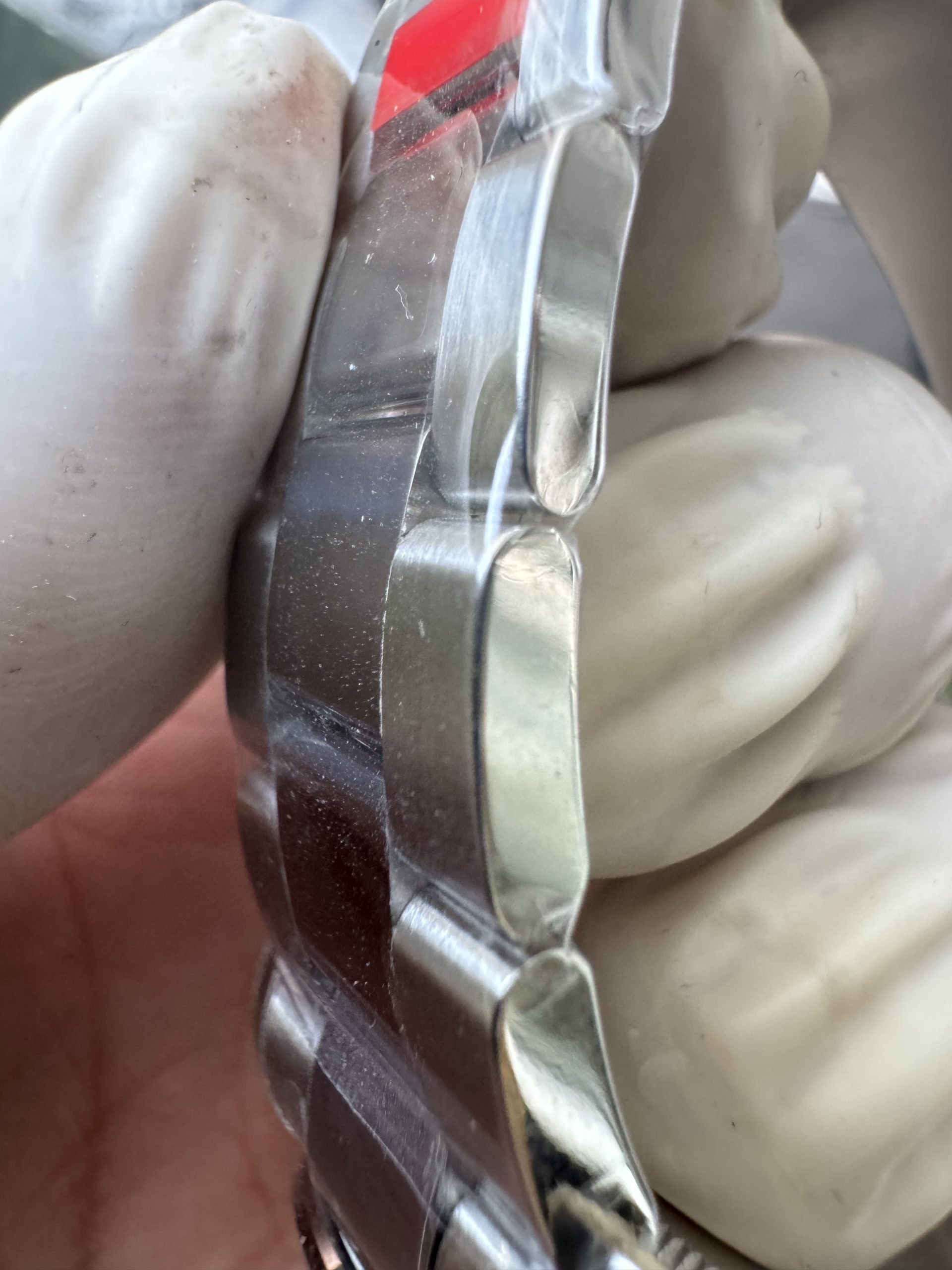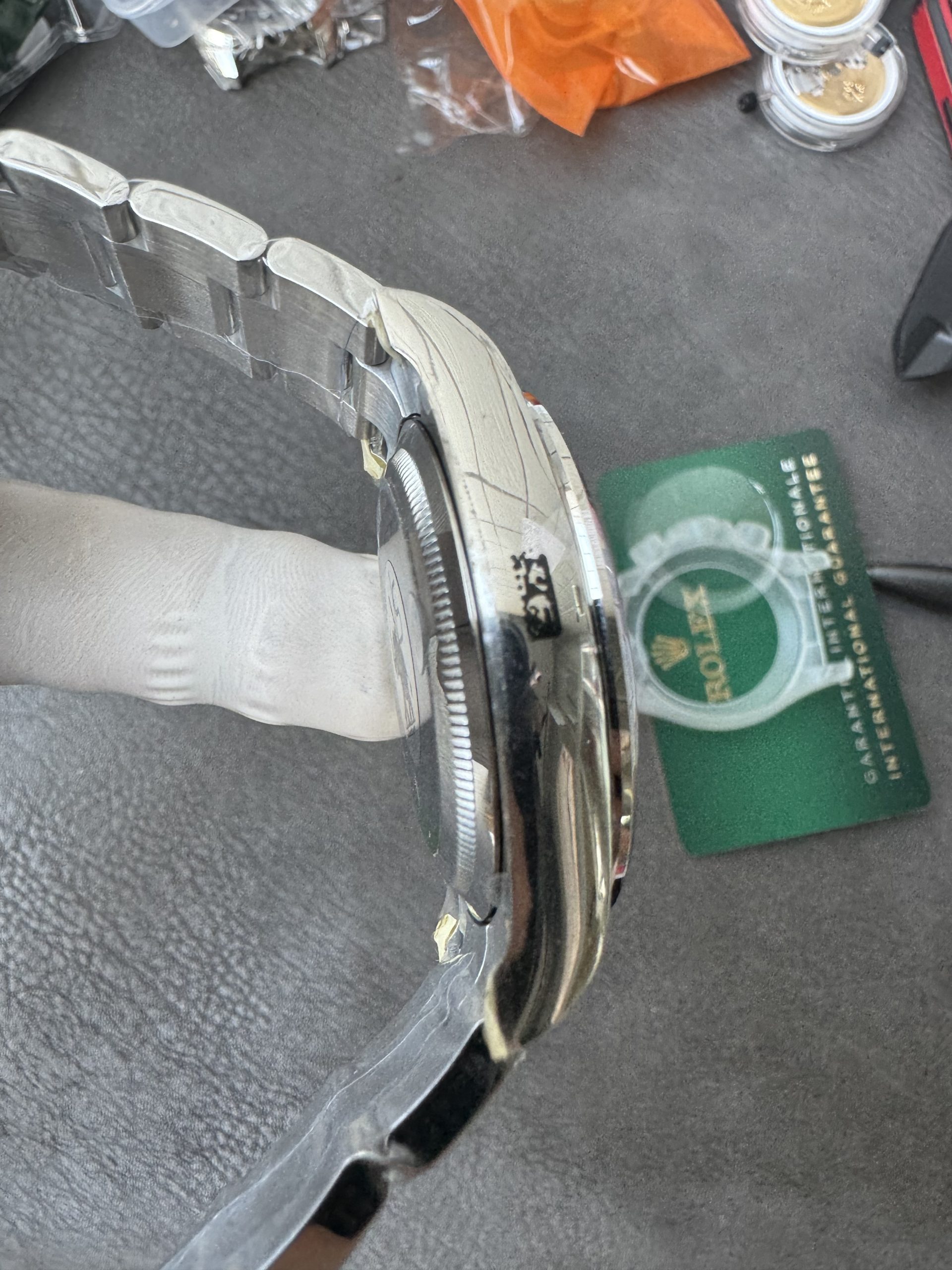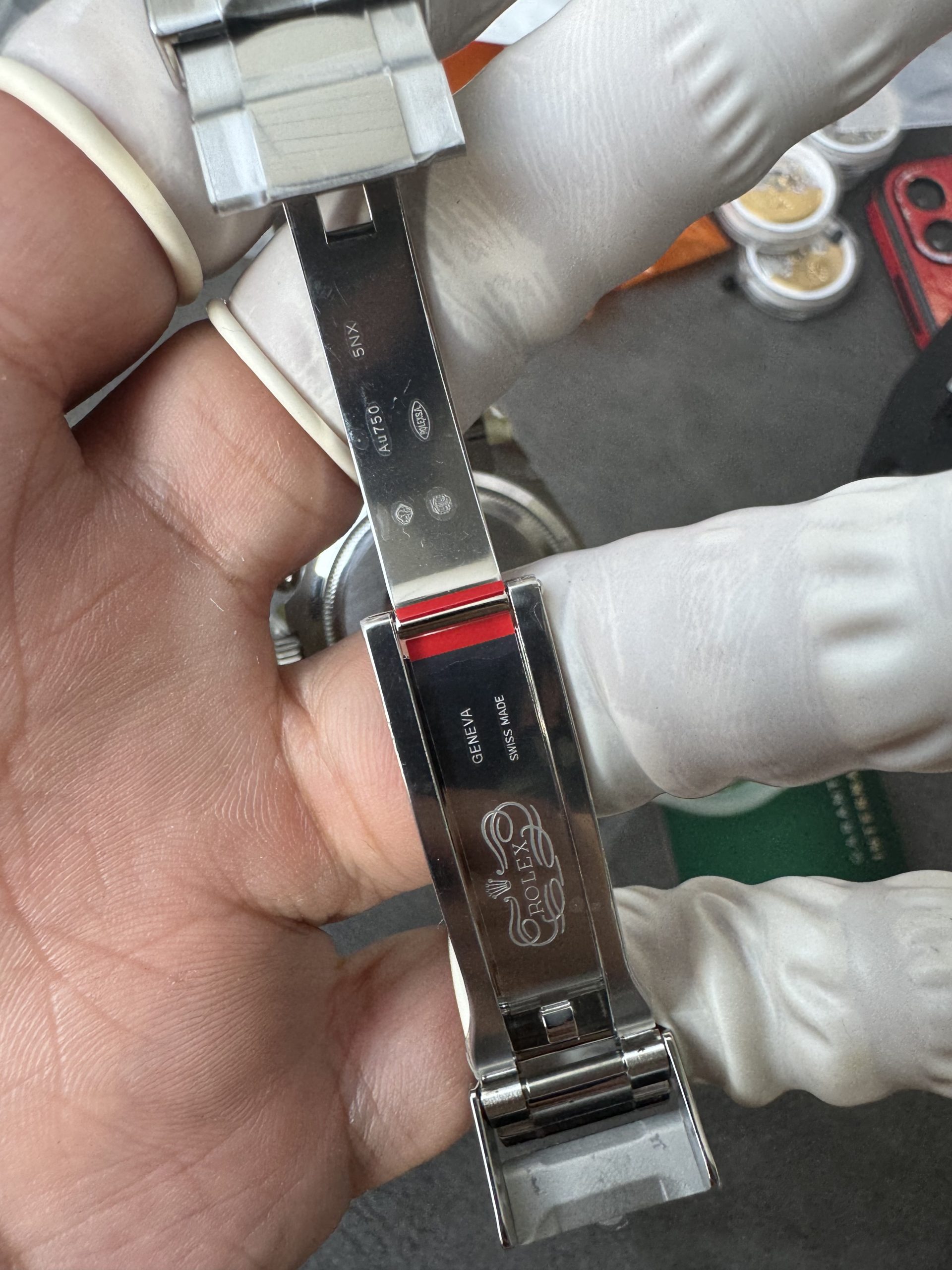 - ブレスレット:904Lステンレススチールオイスターブレスレット。側面から見ても、素材を埋め込んだような隙間が一切見えない一体成型構造。ブレスのコマ一つ一つにも重量感があります。