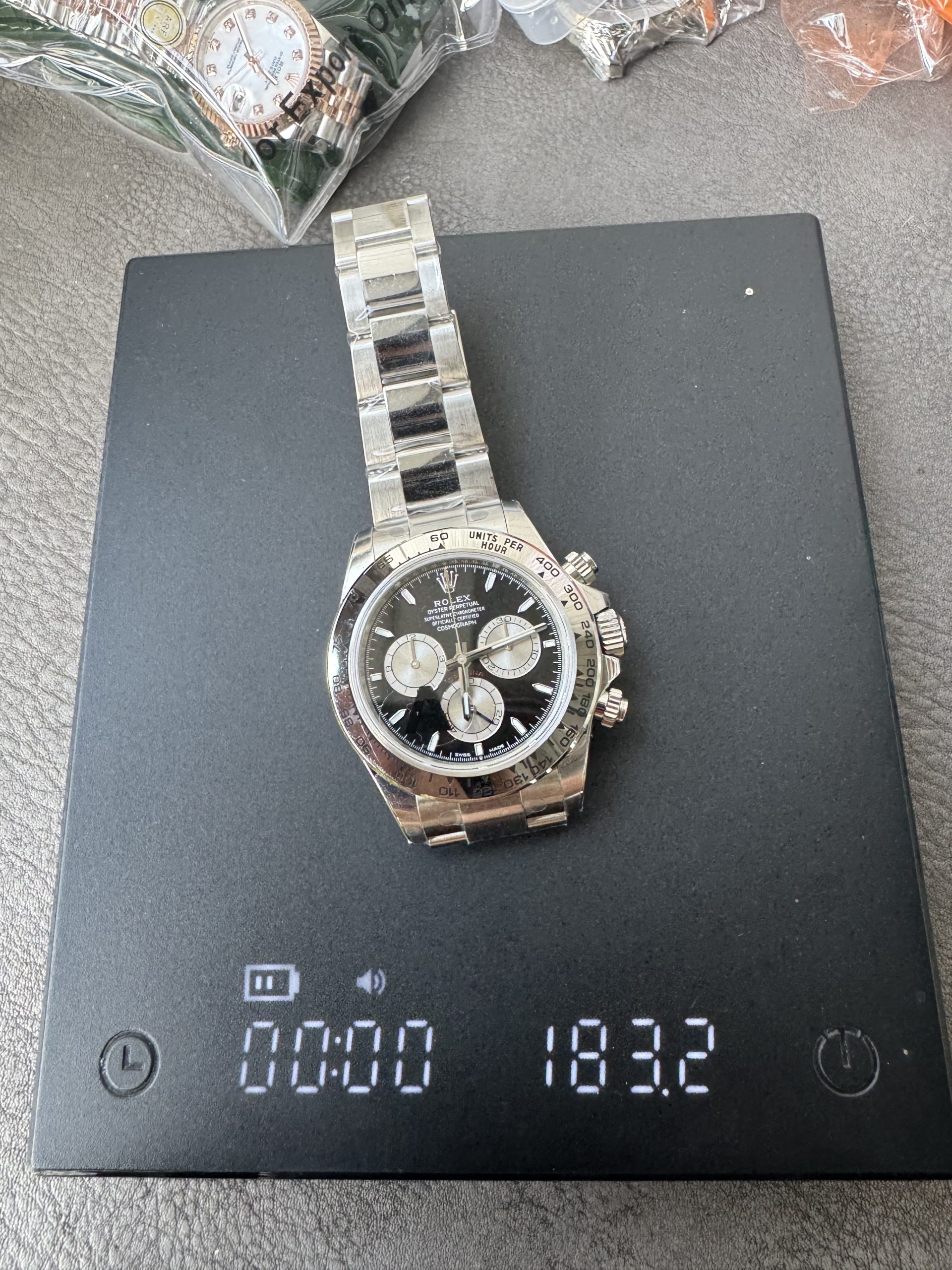 - ベゼル:18Kホワイトゴールドメッキ・タキメーターベゼル。文字盤やケースとの一体感ある輝き。