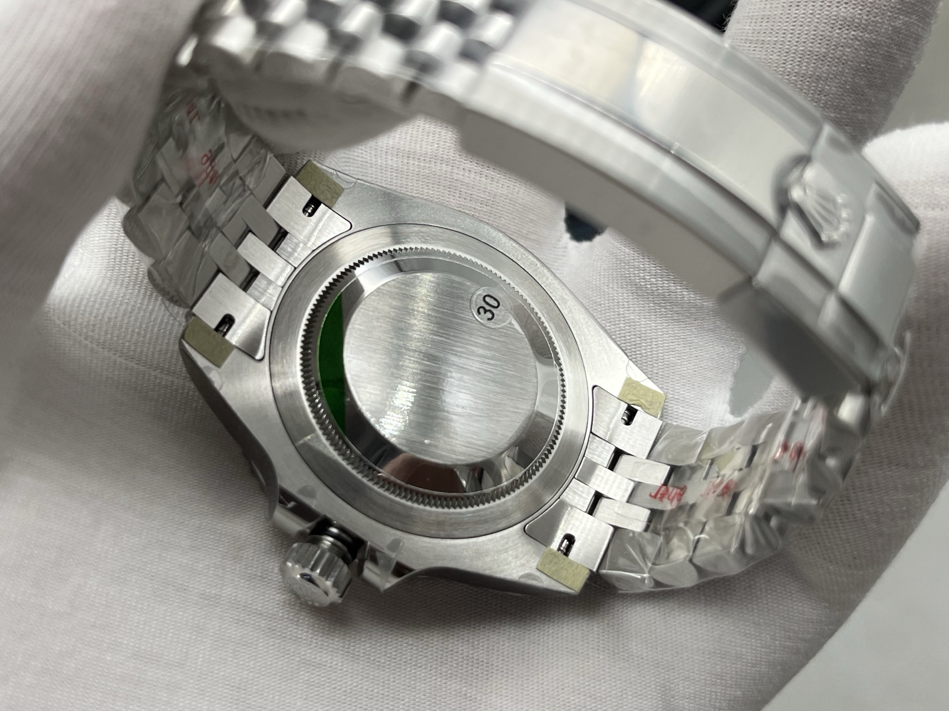- ブレスレット:904Lステンレス製ジュビリーブレス。柔らかくしなやかな可動域で装着感が良い。