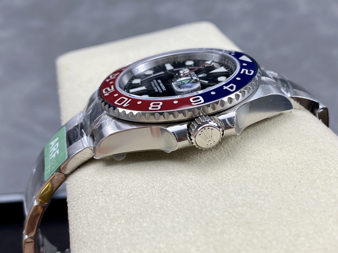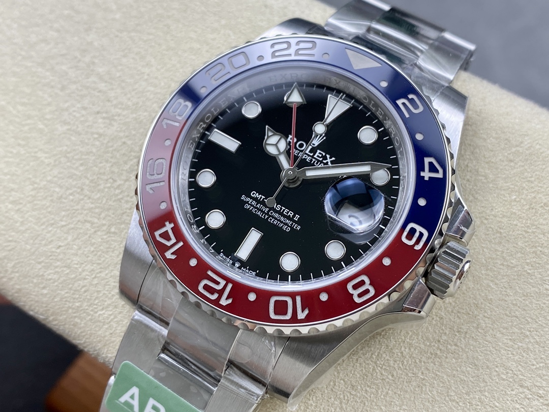 ARファクトリーの「GMTマスターII ペプシ」は、正規品に非常に近い完成度を誇る再現モデルです。特に、赤青セラミックベゼルは紫外線照射下で色合いが変化し、正規品と完全に一致する仕上がり。丹東3285一体構造ムーブメントは72時間のパワーリザーブを提供し、GMT針の調整機能や日付のクイックチェンジも正規品と同じ操作感です。全体的に、904Lスチール素材、ブルーサファイアクリスタル風防、高精度の陶瓷ベゼルなど、細部まで正規品に迫る仕上がりが実現されています。