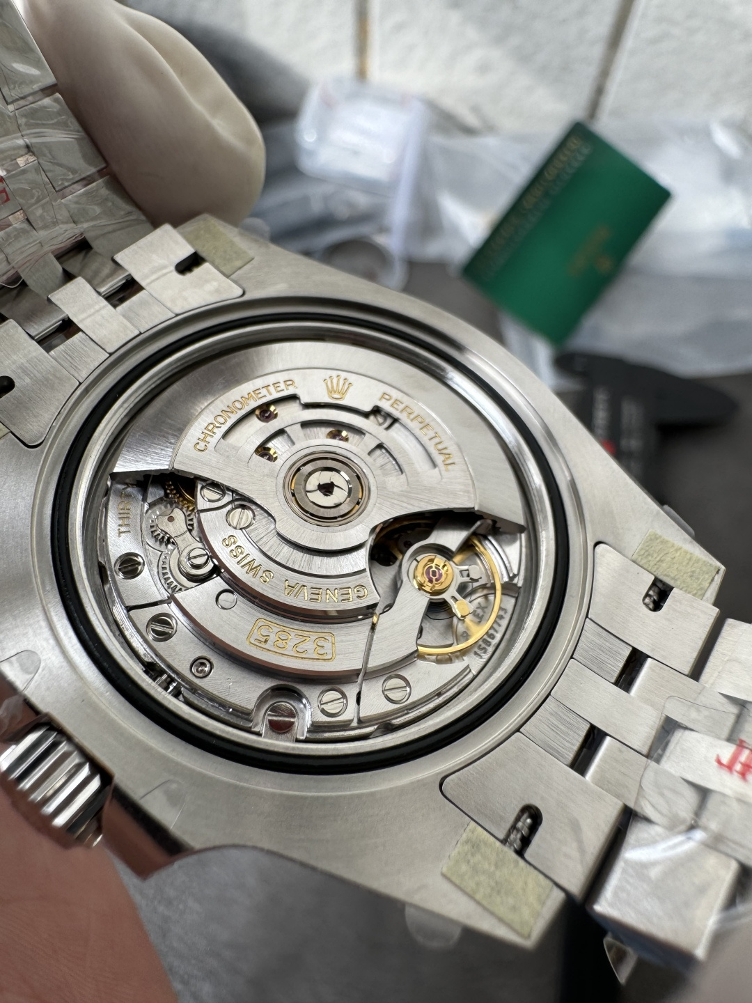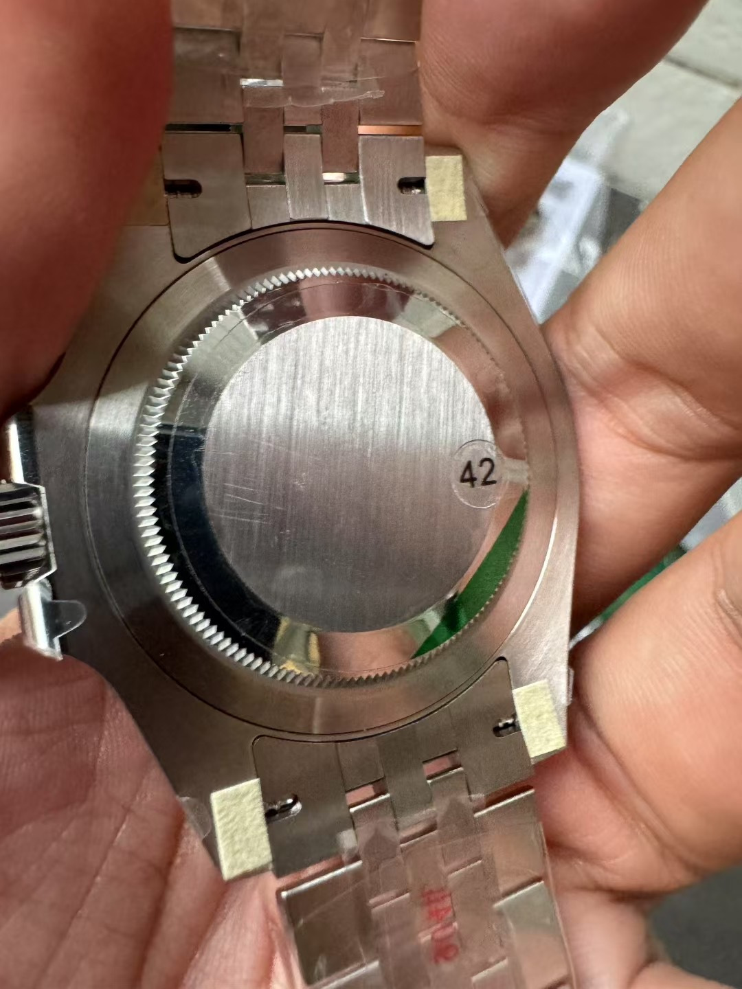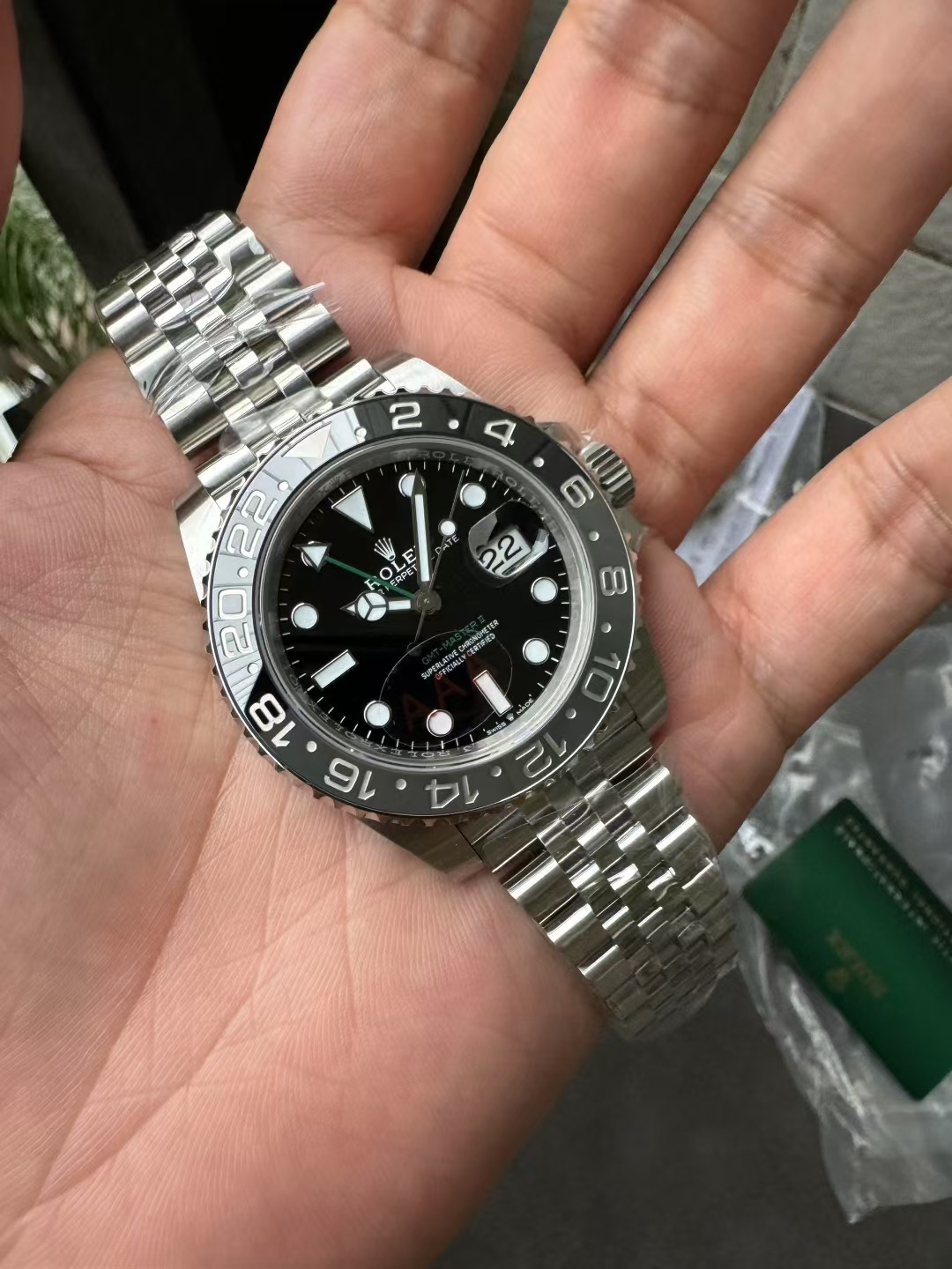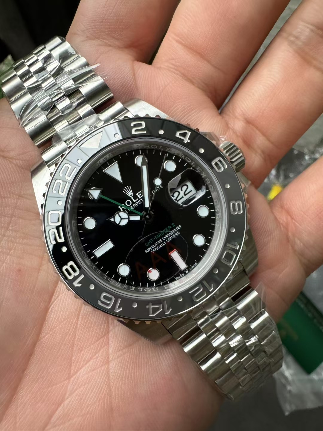 - 針:メルセデス針(夜光)。分針針先は最も鋭く、秒針の平整感も正規品と一致。GMT針は鮮やかな赤色で、正規品と色合いも一致。