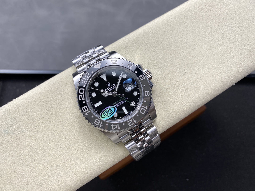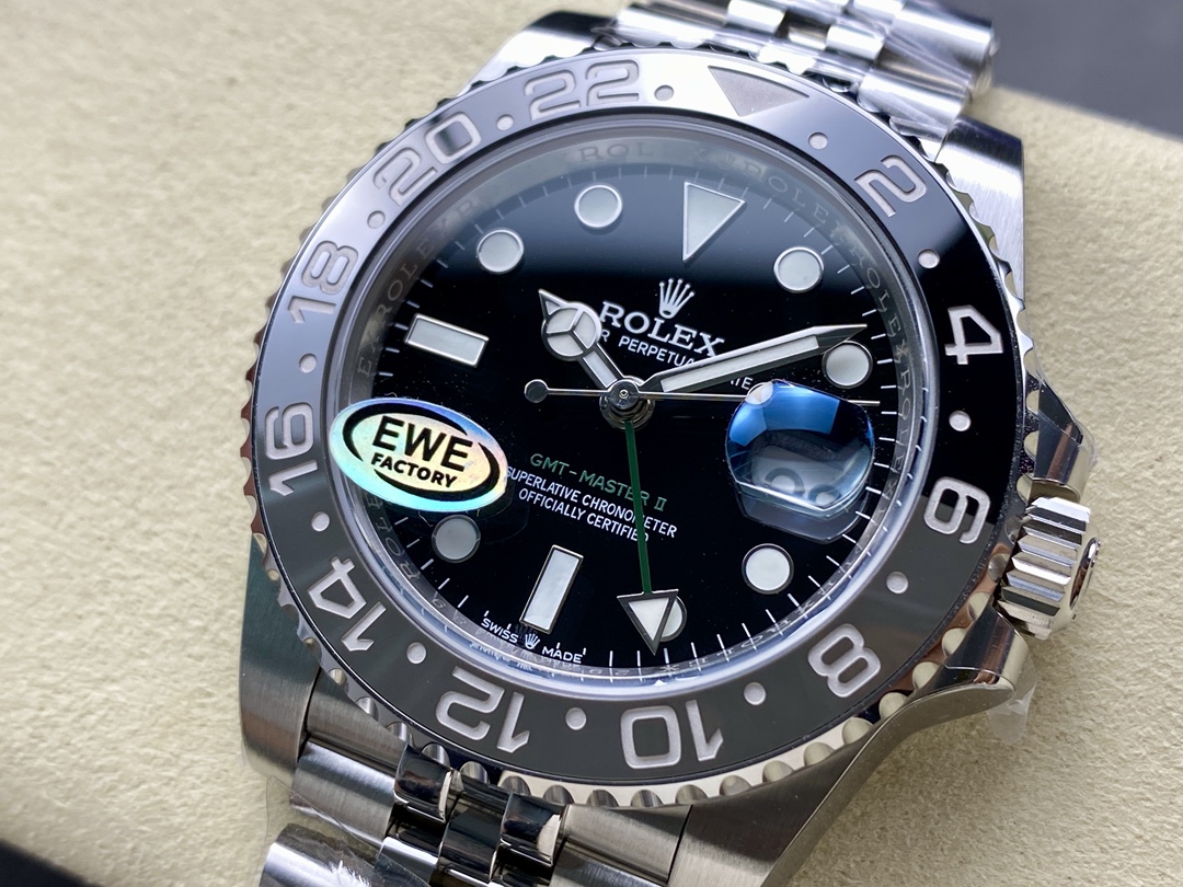 EWEファクトリー最新V5バージョンの「GMTマスターII 黒灰ベゼル」は、落ち着いたブラック×グレーのセラミックベゼルを採用し、実機に極めて近い精巧な仕上げを誇ります。特に、Cal.3285一体型ムーブメントは72時間パワーリザーブに対応し、GMT針の位置構造・時針単独可動によるクイックジャンプ式のカレンダー調整など、実機と同じ操作性を忠実に再現しています。さらに、自社選別の輸入904Lステンレスを使用し、耐蝕性・光沢感・重量感のすべてが非常に高いレベルで統一。