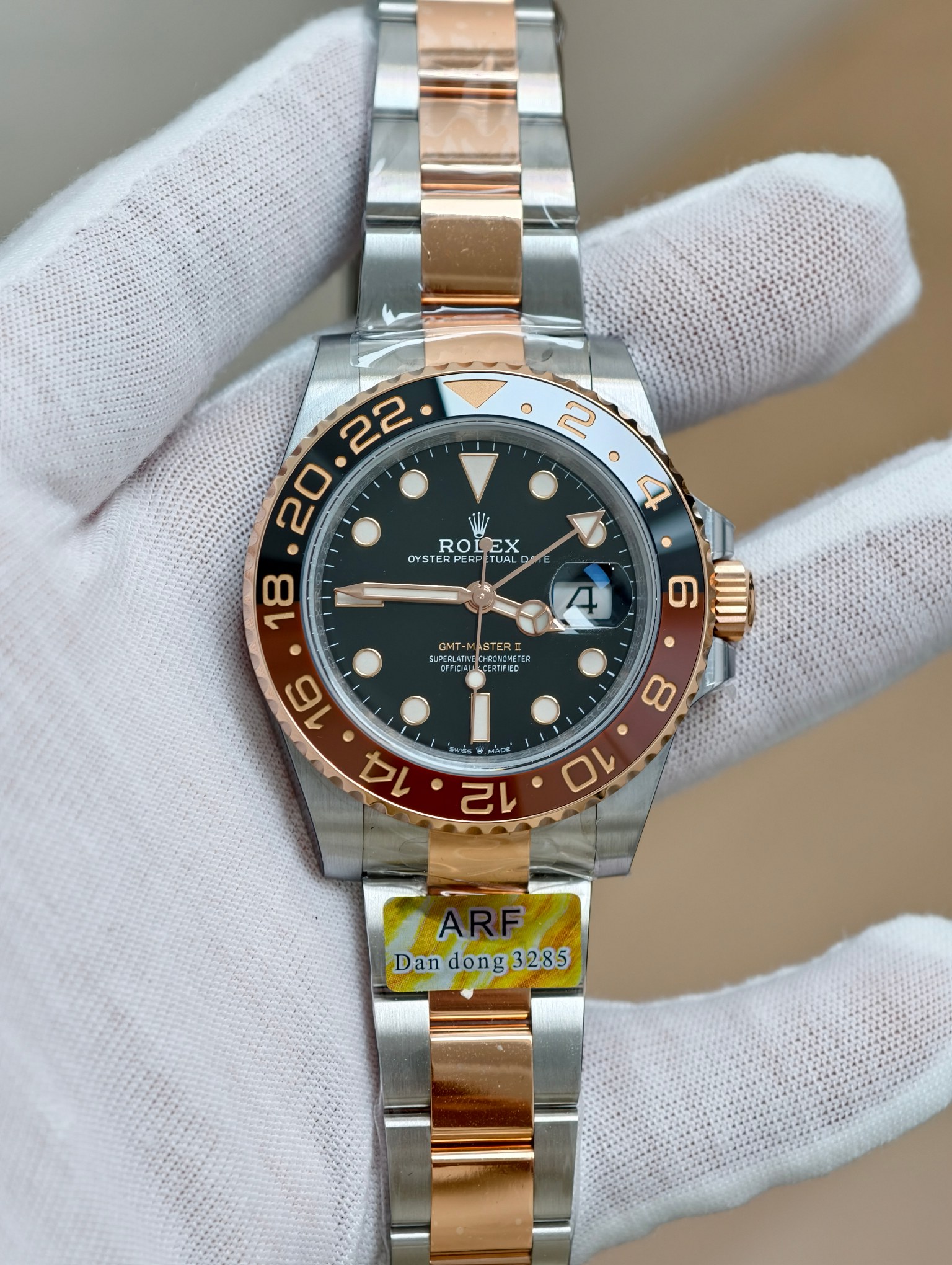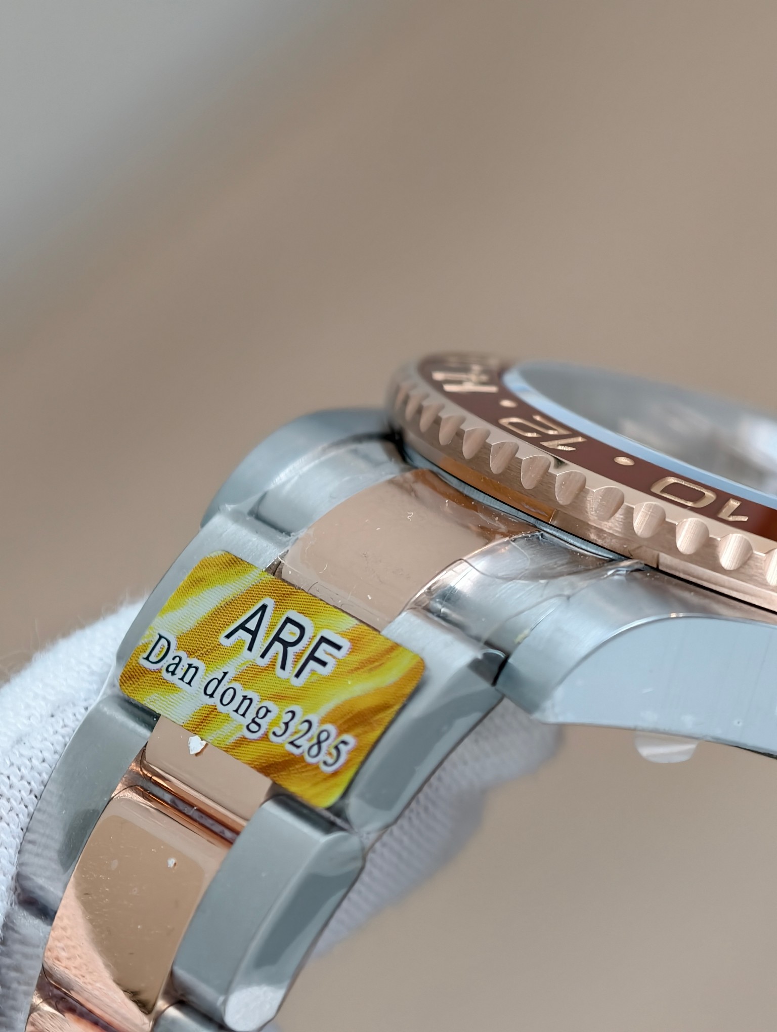 ARFファクトリーのコンビ仕様「GMTマスターII」は、904Lステンレスとローズゴールドカラーの絶妙なツートーンに、ブラウン×ブラックのセラミックベゼルを組み合わせた一本です。丹東3285一体型ムーブメントを搭載し、実機同様のGMT機能と約72時間パワーリザーブを再現。ベゼルの数字はローズゴールド色で立体的に仕上げられ、ブレスレット側面までしっかり色が回り込んだ“漏れ鋼なし”のコンビ仕上げが高級感を一段と引き上げます。配重を施したケース&ブレスのバランスにより、腕に載せたときの重みも本物に非常に近い仕様です。
